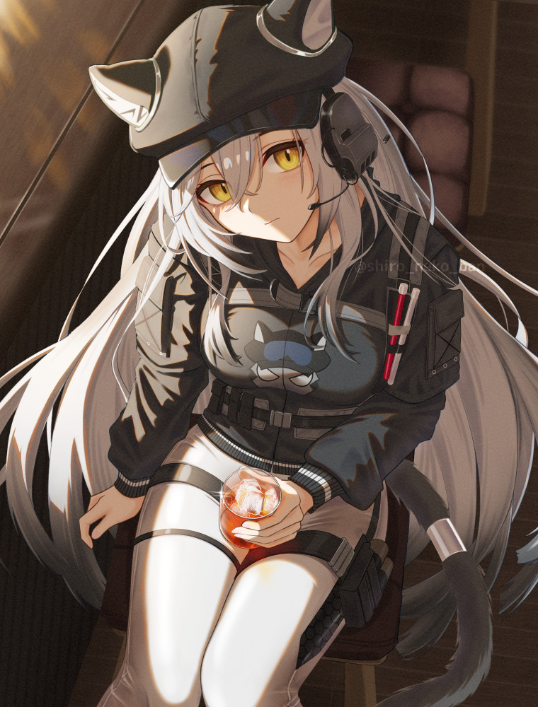 1girl animal_ears arknights closed_mouth collarbone cup hat headphones holding holding_cup ice jacket leopard_ears leopard_girl leopard_tail long_hair long_sleeves looking_at_viewer pants schwarz_(arknights) shironekoban sitting solo tail white_hair yellow_eyes
