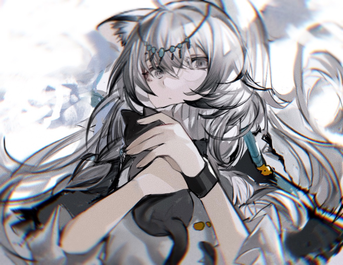 1girl ahoge animal animal_ear_fluff animal_ears arknights black_cat cat closed_mouth commentary floating_hair grey_eyes grey_hair hair_between_eyes hands_up holding holding_animal long_hair pramanix_(arknights) snow_leopard_ears solo sweater untranslatable_commentary theta.ming turtleneck turtleneck_sweater upper_body white_sweater