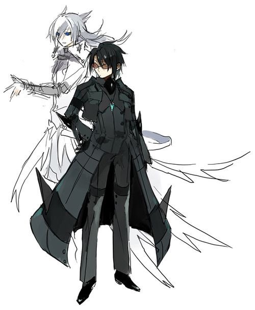 2boys black_gloves black_hair blue_eyes boots elbow_gloves gen_5_pokemon gloves grey_footwear jacket legendary_pokemon male_focus multiple_boys nintendo personification pokemon reshiram simple_background spiked_hair sunglasses white_background white_hair yara_kami_meiosei zekrom