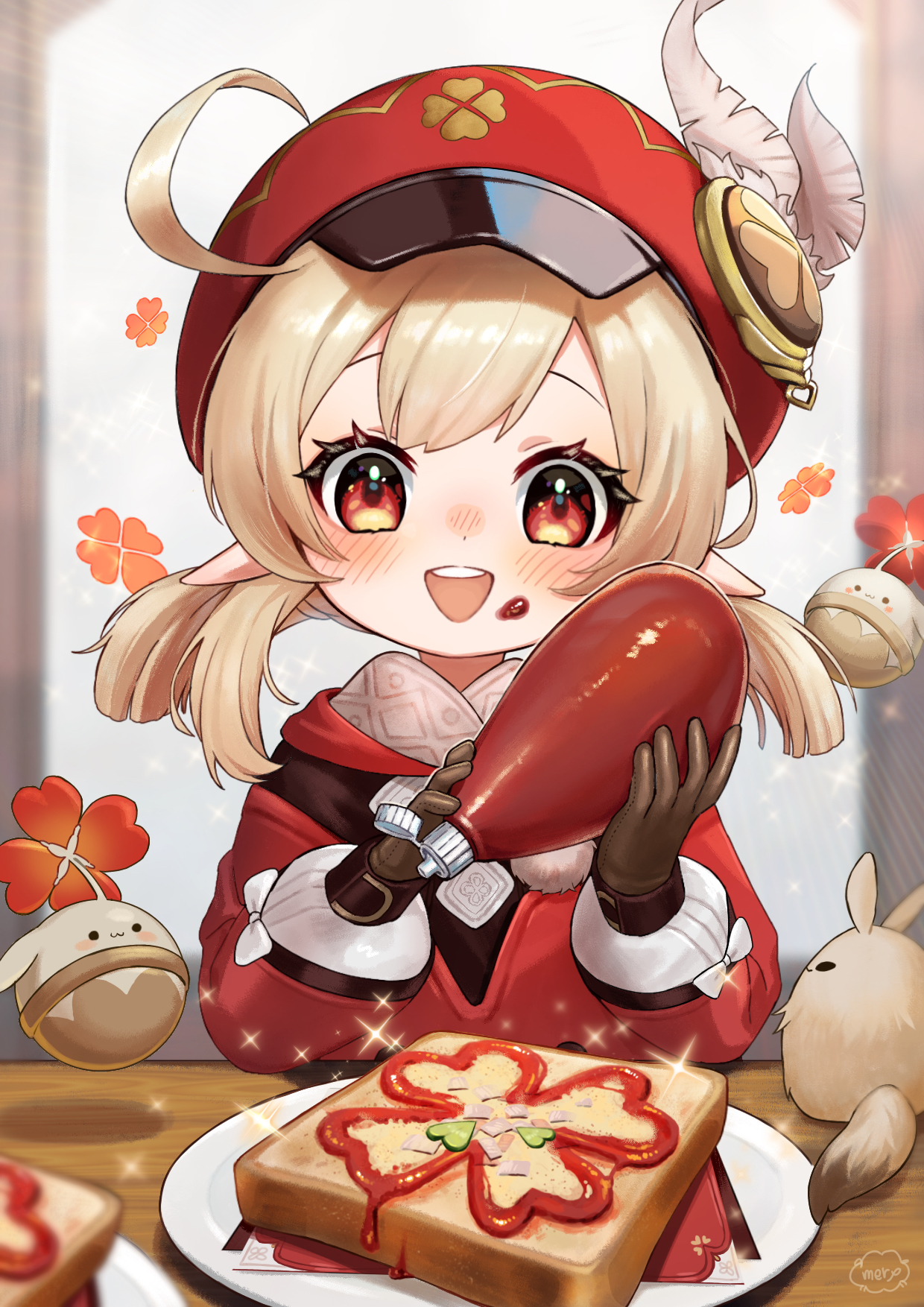 1girl :d ahoge blurry bottle bread bread_slice newsboy_cap child clover_print coat commentary_request depth_of_field dodoco_(genshin_impact) fish-flavored_toast_(genshin_impact) food genshin_impact hair_between_eyes hat hat_feather hat_ornament highres hitsujino_mery holding holding_bottle jumpy_dumpty klee_(genshin_impact) light_smile long_hair long_sleeves looking_at_viewer low_twintails open_mouth orange_eyes plastic_bottle plate pointy_ears red_coat red_hat sidelocks smile solo stuffed_animal stuffed_toy table toast tomato_sauce twintails