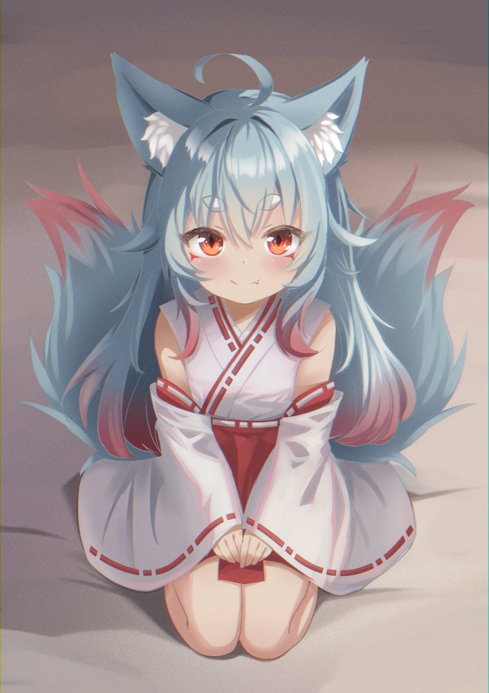 1girl ahoge animal_ear_fluff animal_ears detached_sleeves fox_ears fox_girl fox_tail gradient_hair grey_hair hakama hakama_skirt japanese_clothes long_hair looking_at_viewer miko miniskirt multicolored_hair multiple_tails original red_eyes red_hair red_hakama red_skirt shirt sitting skirt smile solo tail tamano_umika thighs virtual_youtuber white_shirt white_sleeves
