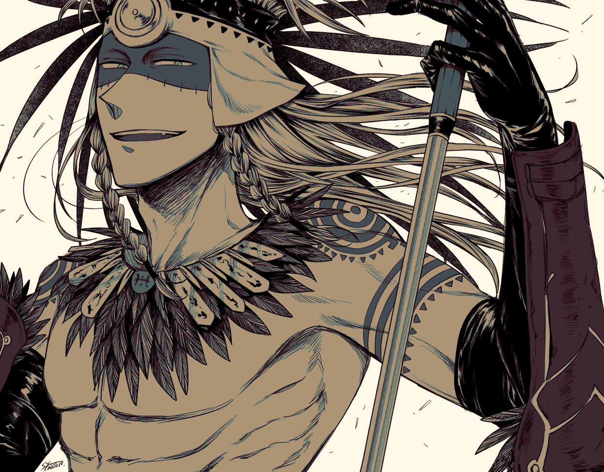 1boy aztec bare_shoulders blonde_hair blue_eyes braid fate/grand_order fate_(series) gloves hair_ornament holding holding_polearm holding_weapon long_hair looking_at_viewer male_focus polearm simple_background smile solo tattoo tezcatlipoca_(fate) tezcatlipoca_(third_ascension)_(fate) traditional_clothes twin_braids upper_body weapon white_background yuuzuki230