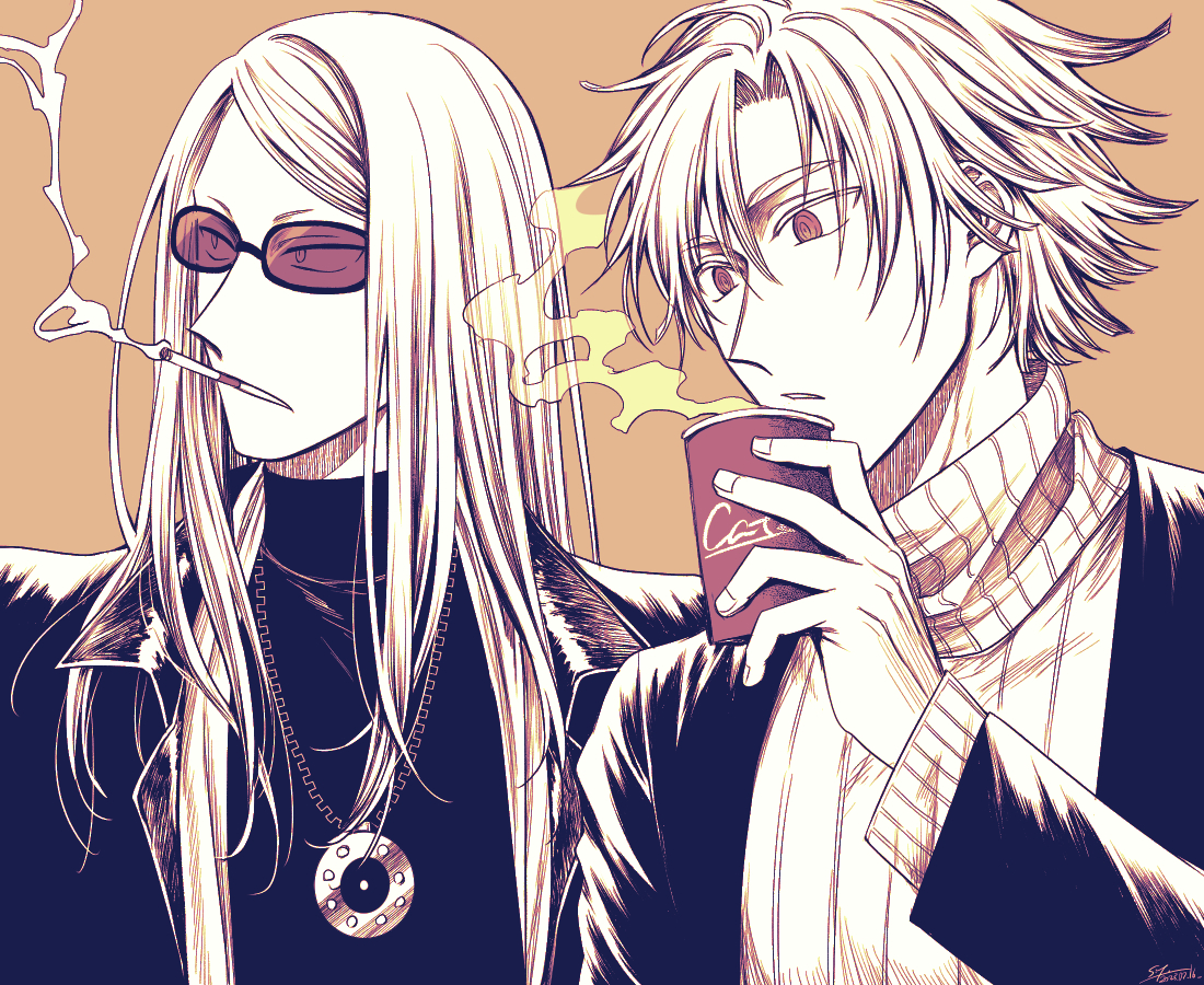 2boys black_coat blonde_hair blue_eyes cigarette coat coffee cup daybit_sem_void fate/grand_order fate_(series) glasses holding holding_cup jacket jewelry long_hair long_sleeves male_focus multiple_boys necklace open_clothes open_jacket orange-tinted_eyewear shirt short_hair simple_background smoke sunglasses tezcatlipoca_(fate) tinted_eyewear white_shirt yuuzuki230