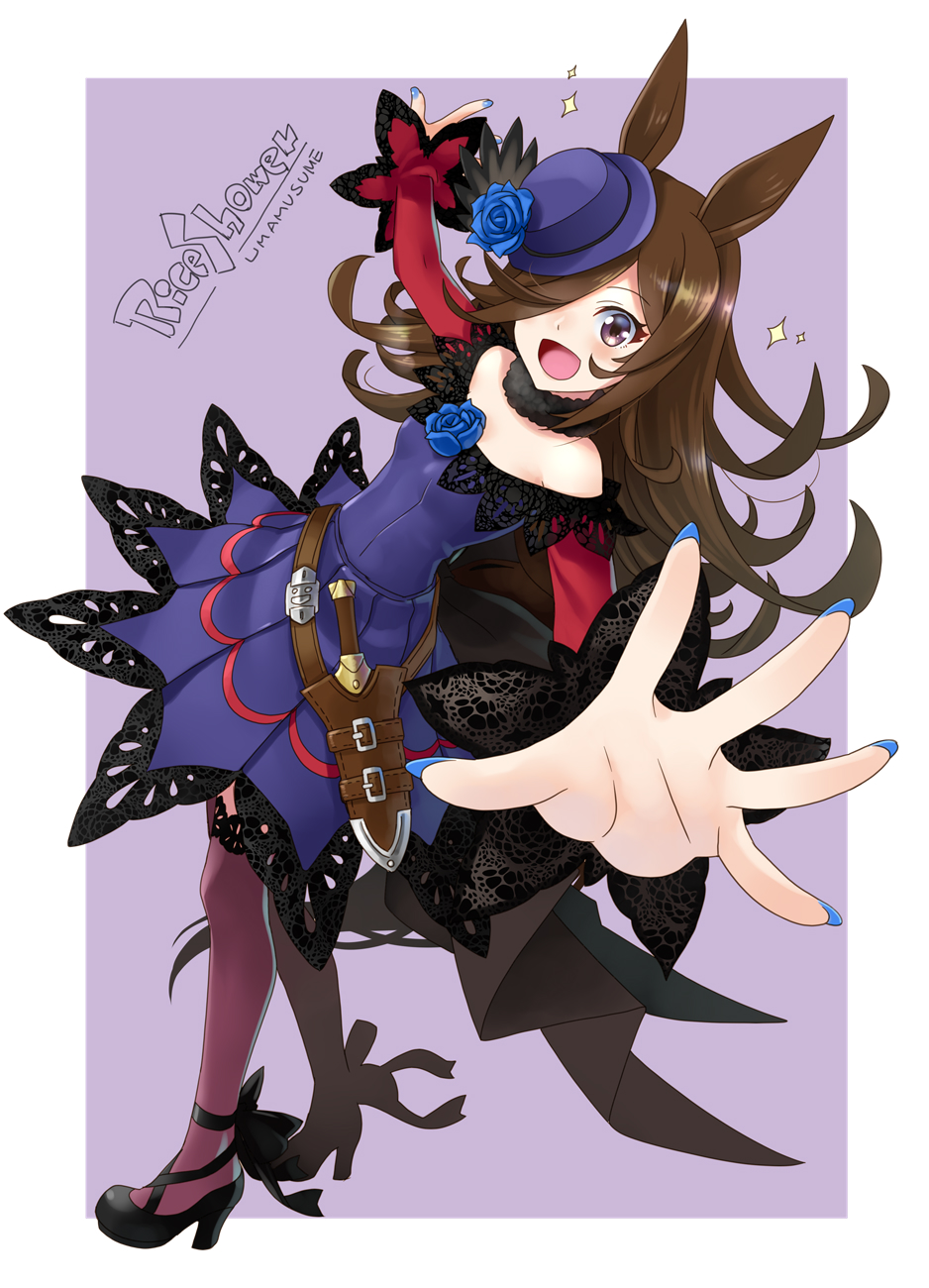 1girl animal_ears back_bow belt black_belt black_bow black_footwear black_thighhighs blue_flower blue_hat blue_rose bow character_name commentary copyright_name dagger dress flower foreshortening from_side fur_collar hair_over_one_eye hat hat_flower high_heels highres horse_ears horse_girl horse_tail katahira_masashi knife long_bangs long_hair long_sleeves looking_at_viewer nail_polish off-shoulder_dress off_shoulder open_mouth outstretched_arm purple_dress purple_eyes purple_nails reaching reaching_towards_viewer rice_shower_(umamusume) rose sheath sheathed short_dress smile solo sparkle standing tail thighhighs tilted_headwear umamusume weapon