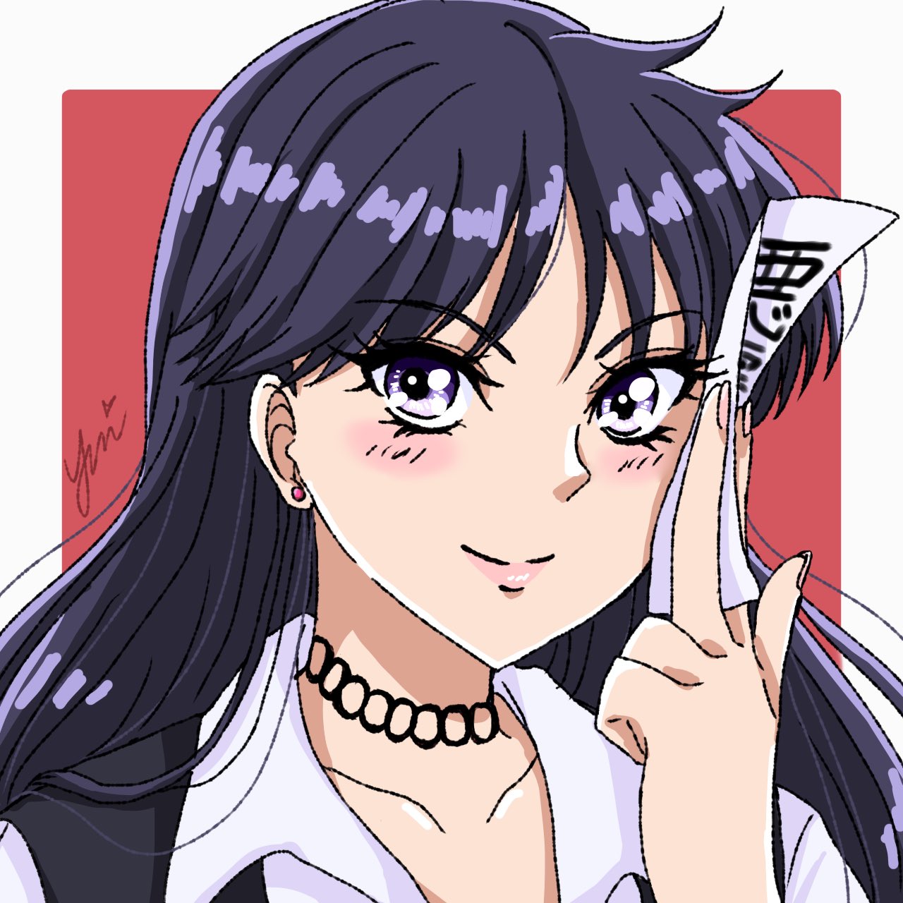 1girl bishoujo_senshi_sailor_moon black_hair choker earrings highres hino_rei jewelry lips long_hair ofuda purple_eyes purple_hair shirt solo stud_earrings vest white_background white_shirt yui_u86