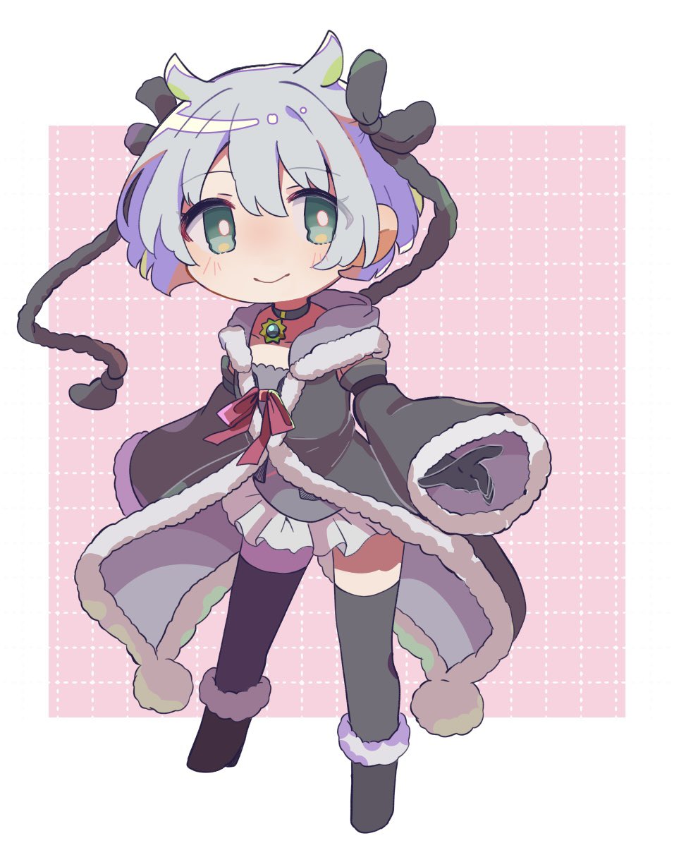 1girl aqua_eyes aqua_gem azusa_mifuyu black_choker blush boots border chibi choker coattails cross-laced_clothes cross-laced_dress detached_sleeves dress eyes_visible_through_hair frilled_dress frills fur-trimmed_boots fur-trimmed_jacket fur-trimmed_sleeves fur_trim gem gloves grey_boots grey_dress grey_gloves grey_hair grey_jacket grey_ribbon grey_sleeves grey_thighhighs grid_background hair_horns hair_ribbon hara_(nanohara) hood hood_down hooded_jacket jacket legs_apart long_sleeves looking_at_viewer magia_record:_mahou_shoujo_madoka_magica_gaiden magical_girl mahou_shoujo_madoka_magica no_nose pendant_choker pink_background pink_ribbon pom_pom_(clothes) ribbon short_dress short_hair sleeveless sleeveless_jacket smile solo standing tailcoat thighhighs white_border