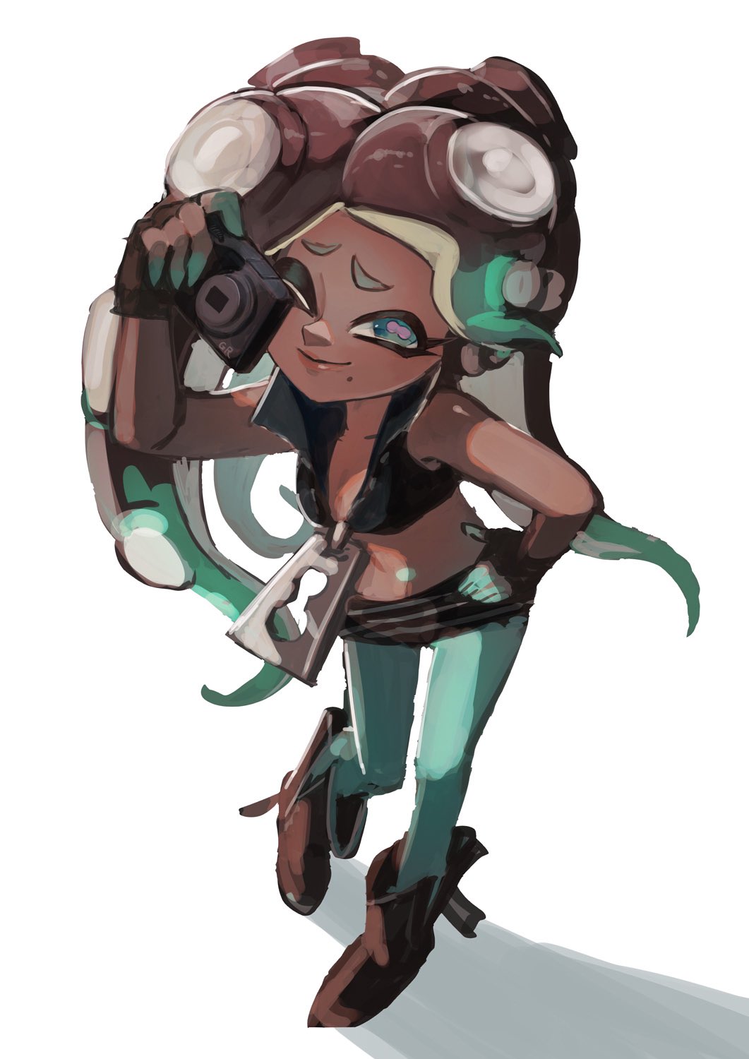 1girl bare_shoulders camera crop_top dark-skinned_female dark_skin fingerless_gloves gloves green_eyes highres looking_at_viewer marina_(splatoon) nintendo octoling one_eye_closed sizu sleeveless splatoon_(series) splatoon_2 tentacle_hair