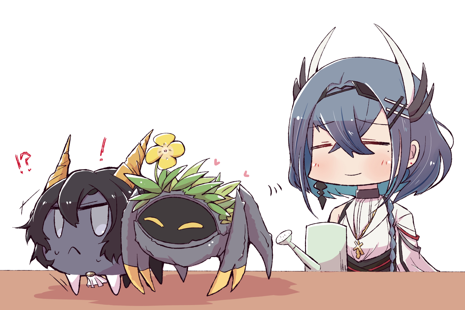 !? 1girl ^_^ arknights bare_shoulders black_hair black_hairband blush braid cantabile_(arknights) closed_eyes closed_mouth commission domesticated_metal_crab_(arknights) dragon_bean_(arknights) ebenholz_(arknights) flower grey_eyes hair_between_eyes hair_ornament hairband heart horns long_hair shirt simple_background single_braid sleeveless sleeveless_shirt smile sweat watering_can white_background white_shirt yellow_flower yodo_rado