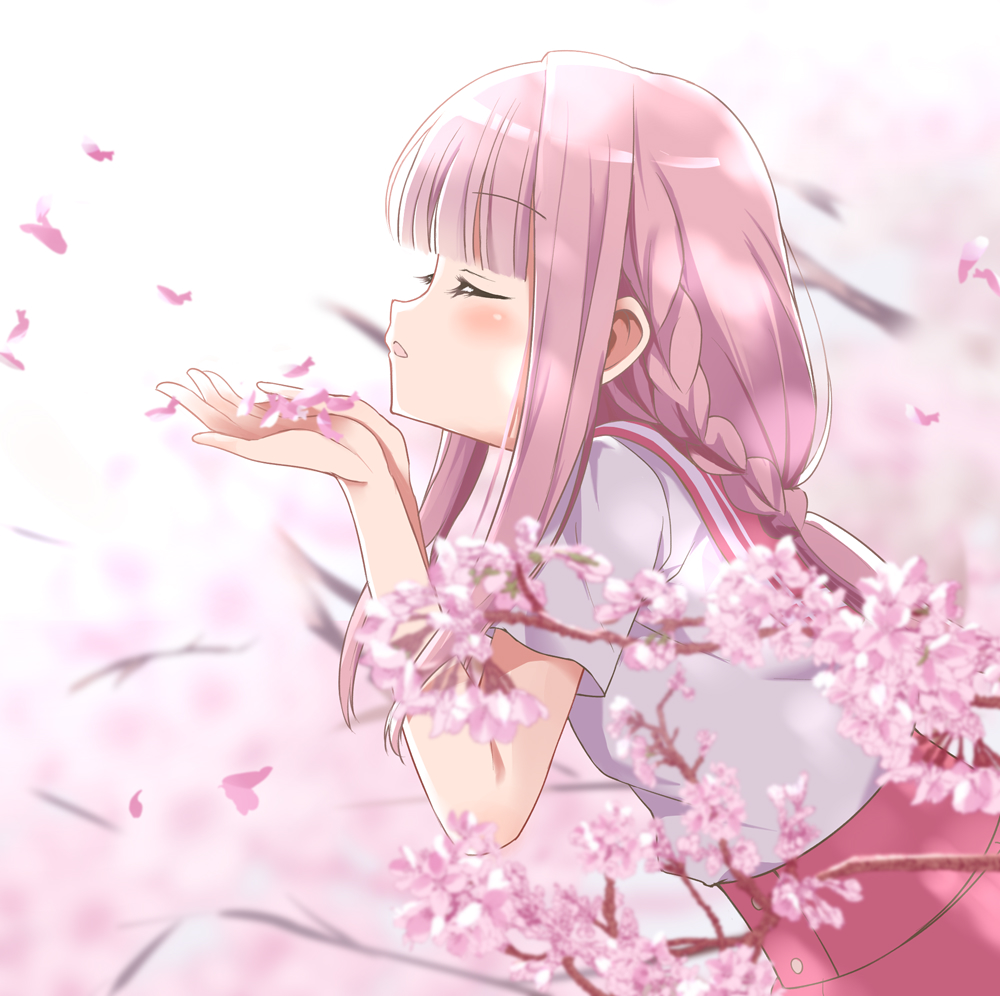 1girl adapted_costume blowing blunt_bangs blush braid branch buttons cherry_blossoms closed_eyes flower from_side hands_up kamihama_university_affiliated_school_uniform long_hair low_ponytail magia_record:_mahou_shoujo_madoka_magica_gaiden mahou_shoujo_madoka_magica parted_lips petals pink_flower pink_hair ponytail profile red_sailor_collar red_skirt rikopin sailor_collar school_uniform serafuku shirt short_sleeves side_braids sidelocks skirt solo tamaki_iroha very_long_hair white_shirt