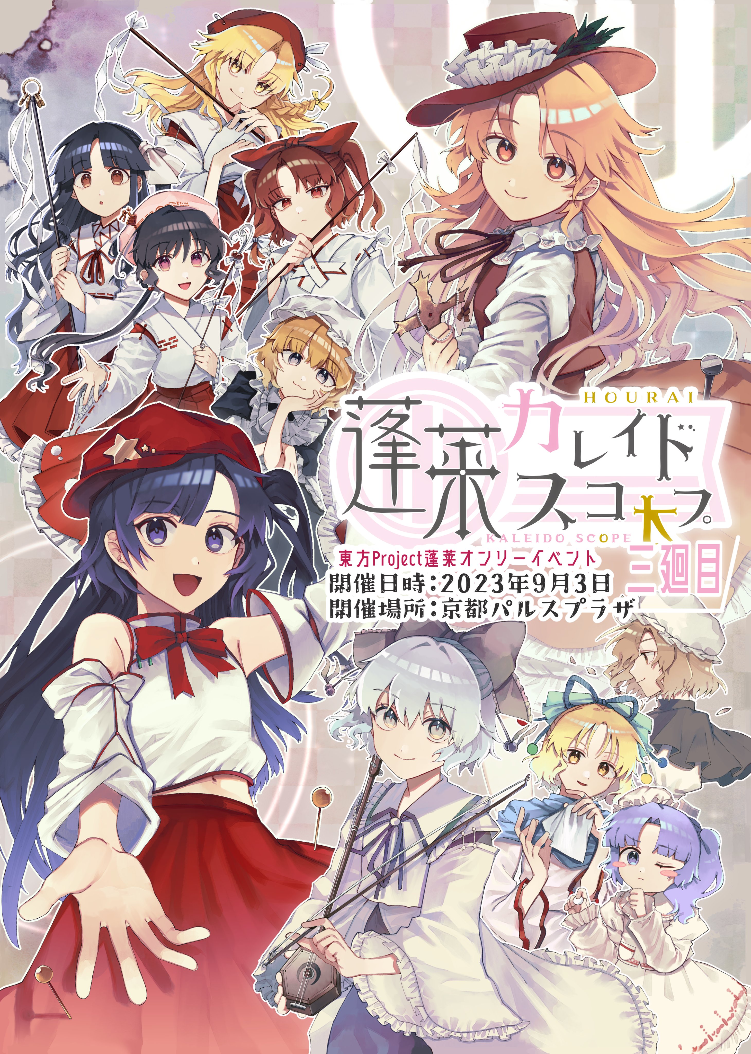 6+girls :d absurdres bare_shoulders beret black_capelet black_dress black_hair black_skirt blonde_hair blonde_oekaki_girl_(touhou) blonde_shrine_maiden_from_a_future_era_(touhou) blue_eyes blunt_bangs bow bow_(music) brown_eyes brown_headwear brown_ribbon brown_skirt brown_vest newsboy_cap capelet cleaning_maid_(touhou) closed_mouth cross detached_sleeves dolls_in_pseudo_paradise dress erhu flat_cap flat_chest frilled_hat frilled_skirt frills girl_who_trained_on_mt._haku_(touhou) gohei green_bow green_ribbon grey_bow grey_eyes grey_hair hair_bow hair_ribbon hakama hakama_skirt hat hat_feather hat_ornament highres hime_cut holding holding_cross hourai_girl_(touhou) jacket_girl_(dipp) japanese_clothes juliet_sleeves kimono label_girl_(dipp) light_purple_hair long_hair long_sleeves maid mandarin_collar medium_hair midriff_peek miko mob_cap moonlight's_anti-soul_(touhou) multiple_girls navel neck_ribbon one_eye_closed open_mouth orange_eyes orange_hair outstretched_arm pink_dress portrait_of_exotic_girls puffy_sleeves purple-haired_oekaki_girl_(touhou) purple_eyes red_bow red_headwear red_ribbon red_skirt ribbon round_window satsuki_rin shirt short_hair side_ponytail sidelocks skirt smile stake star_(symbol) star_hat_ornament touhou translation_request very_long_hair vest wadante wavy_hair white_hair white_headwear white_kimono white_ribbon white_shirt wide_sleeves window yellow_eyes