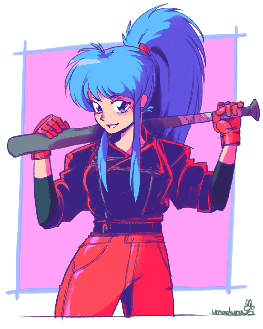 1girl baseball_bat blue_hair botan_(yu_yu_hakusho) breasts denim denim_jacket gloves jacket jeans long_hair looking_at_viewer medium_breasts pants ponytail purple_eyes red_gloves red_jacket smile solo umadura_ero yuu_yuu_hakusho