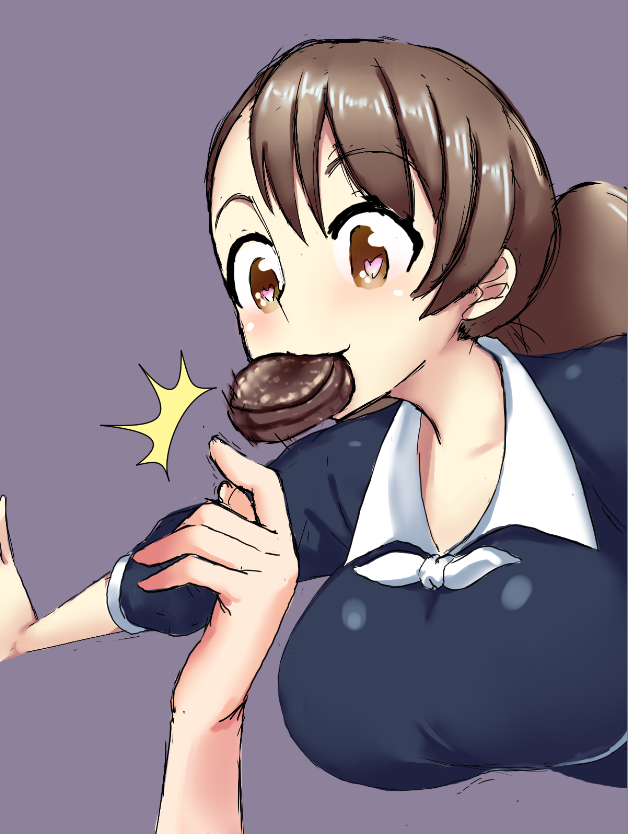 1girl aimu_(senran_kagura) bad_link bad_twitter_link breasts brown_eyes brown_hair chocolate collar food_in_mouth heart heart-shaped_pupils jeaike_art large_breasts long_sleeves raised_eyebrow school_uniform senran_kagura senran_kagura_new_wave smile symbol-shaped_pupils