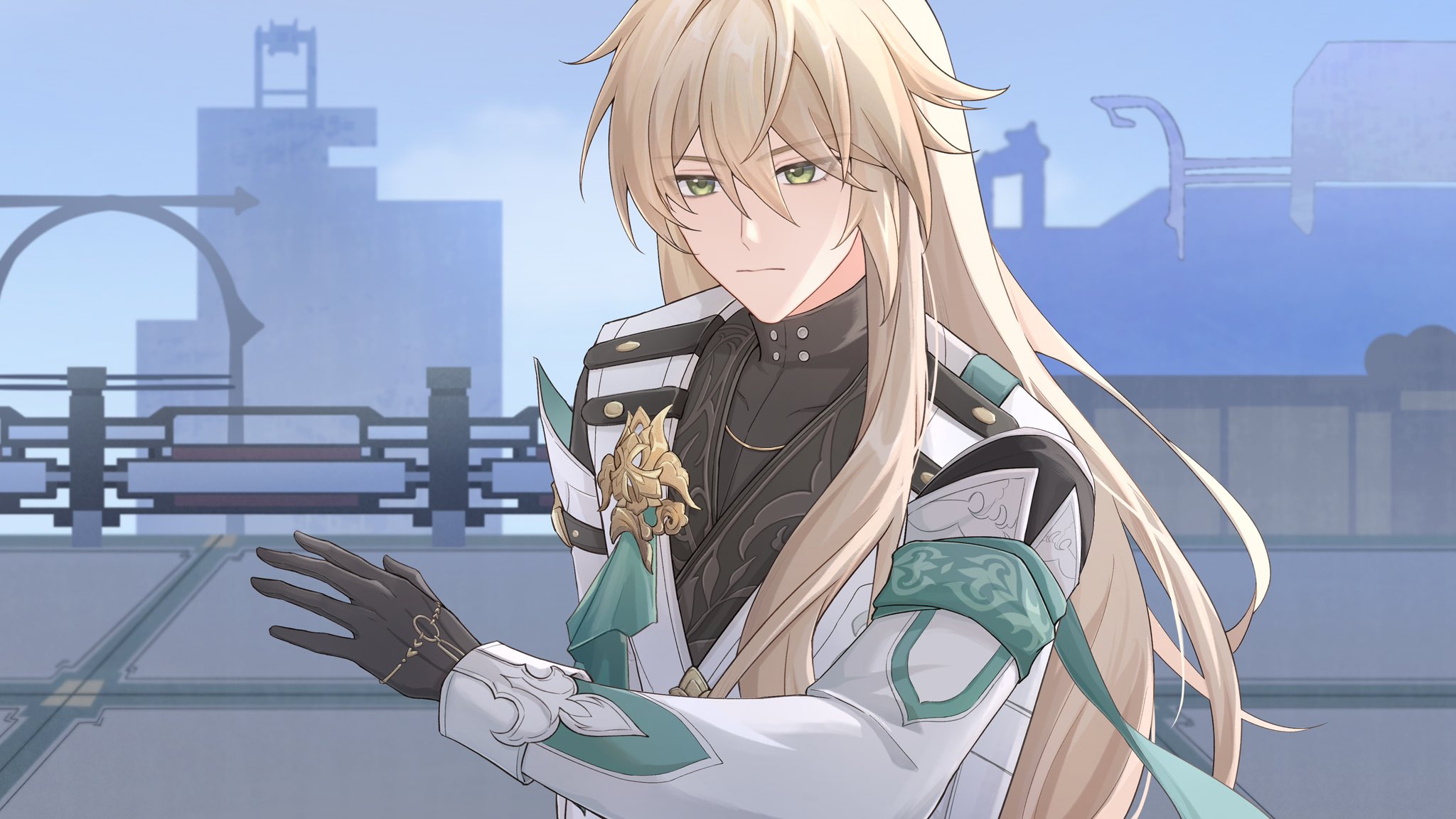 1boy black_gloves blonde_hair blue_sky closed_mouth coat gloves green_eyes highres honkai:_star_rail honkai_(series) long_hair long_sleeves looking_at_viewer luocha_(honkai:_star_rail) napppptt outdoors sky solo upper_body white_coat
