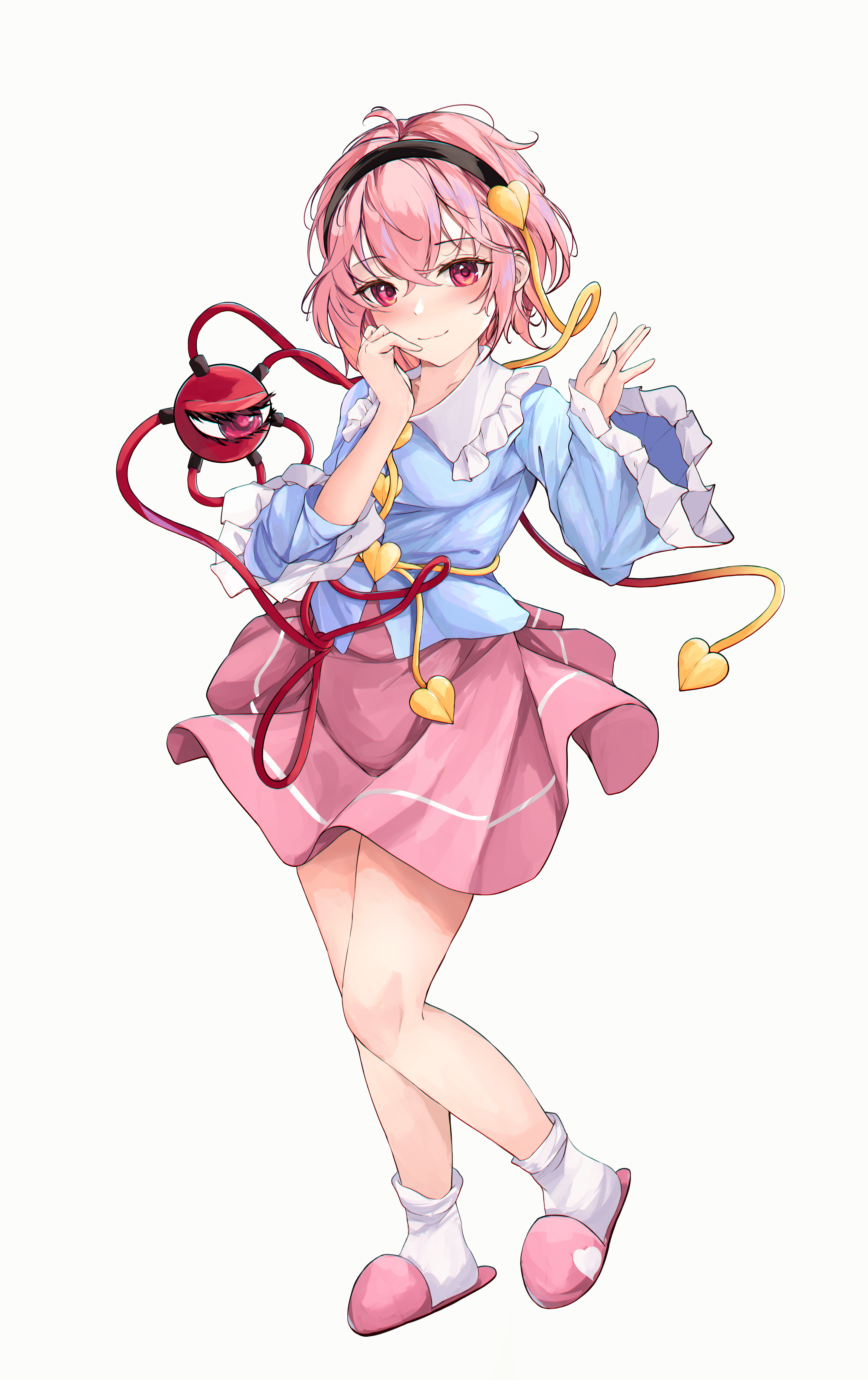 1girl \||/ absurdres blue_shirt crossed_bangs full_body hair_between_eyes hair_ornament hairband hands_up heart heart_hair_ornament highres komeiji_satori looking_at_viewer orchid_(orukido) pink_eyes pink_hair pink_skirt shirt short_hair simple_background skirt slippers smile solo standing third_eye touhou white_background