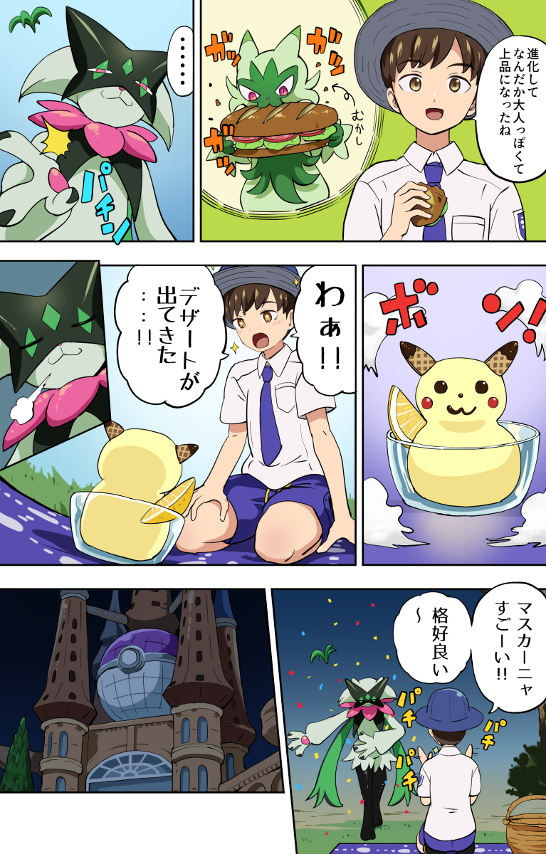 1boy 1other :3 blue_necktie blue_shorts bowing bowl brown_eyes brown_hair castle closed_eyes comic commentary_request confetti eating floragato florian_(pokemon) food gen_1_pokemon hat highres ice_cream male_focus meowscarada necktie nintendo open_mouth pageratta pikachu pokemon pokemon_(creature) pokemon_scarlet_and_violet puff_of_air sandwich school_uniform shorts smile sparkle submarine_sandwich translation_request uva_academy_school_uniform