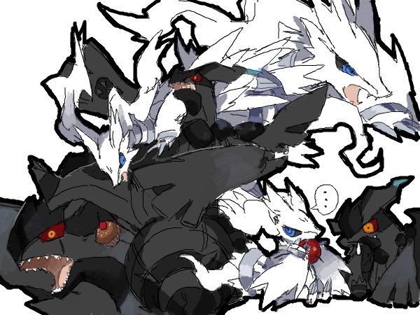 animal_focus arm_support blue_eyes blush chibi commentary dragon full_body gen_5_pokemon happy leaning_back legendary_pokemon long_hair looking_to_the_side nintendo no_humans open_mouth own_hands_together pokemon pokemon_(creature) red_eyes reshiram simple_background sitting smile untranslatable_commentary tongue v_arms white_background white_hair yara_kami_meiosei zekrom