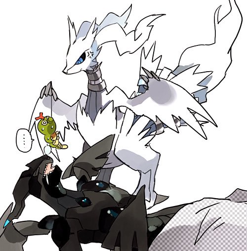 animal_focus arm_support blue_eyes blush caterpie chibi commentary dragon full_body gen_1_pokemon gen_5_pokemon happy leaning_back legendary_pokemon long_hair looking_to_the_side nintendo no_humans open_mouth own_hands_together pokemon pokemon_(creature) red_eyes reshiram simple_background sitting smile untranslatable_commentary tongue v_arms white_background white_hair yara_kami_meiosei zekrom