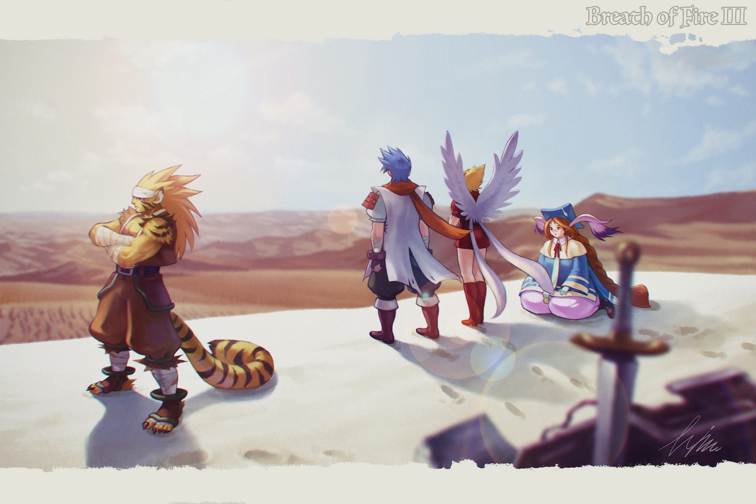 2boys 2girls angel_wings animal_ears blonde_hair boots breath_of_fire breath_of_fire_iii desert dress feathered_wings full_body hairband hat himura_(him-la) long_hair momo_(breath_of_fire) multiple_boys multiple_girls nina_(breath_of_fire_iii) rei_(breath_of_fire) ryu_(breath_of_fire_iii) short_hair white_wings wings