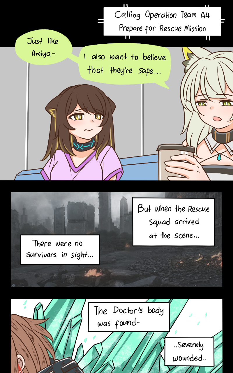 1boy 2girls animal_ear_fluff animal_ears arknights blonde_hair brown_hair building closed_mouth comic crystal cup disposable_coffee_cup disposable_cup doctor_(arknights) english_text folinic_(arknights) green_eyes guin_guin highres holding holding_cup kal'tsit_(arknights) long_hair male_doctor_(arknights) multicolored_hair multiple_girls open_mouth pink_shorts ruins short_sleeves shorts sin_(guin_guin) streaked_hair wavy_mouth