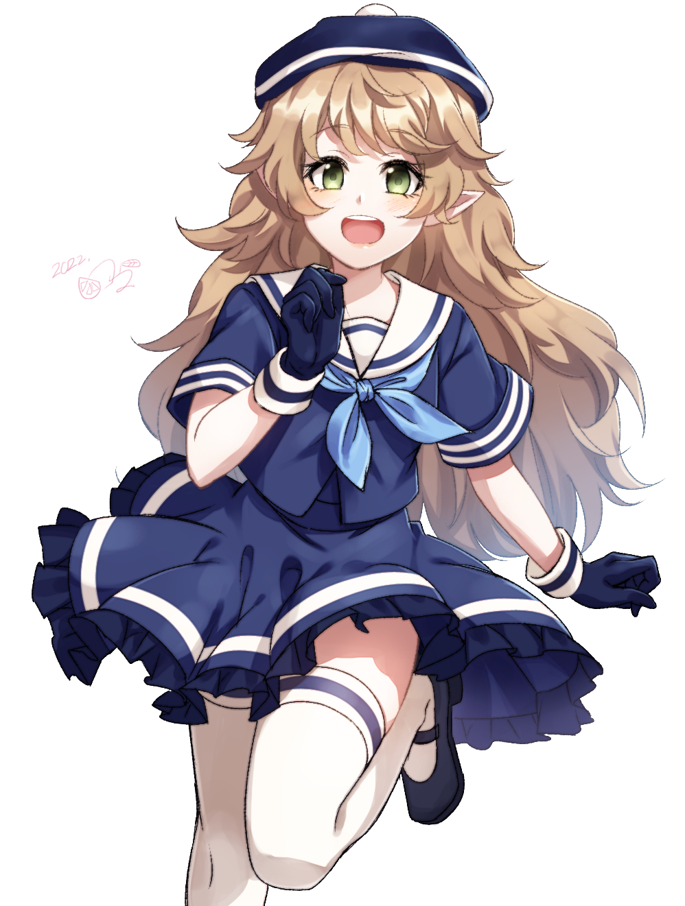 1girl :d alternate_costume blue_gloves blue_hat blue_neckerchief blue_sailor_collar blue_serafuku blue_skirt brown_hair dated druid_girl_(goblin_slayer!) flat_cap frilled_skirt frills gloves goblin_slayer! green_eyes hat highres kankitukou knee_up long_hair looking_at_viewer neckerchief open_mouth pointy_ears sailor_collar school_uniform serafuku short_sleeves simple_background skirt smile solo thighhighs wavy_hair white_background white_sailor_collar white_thighhighs