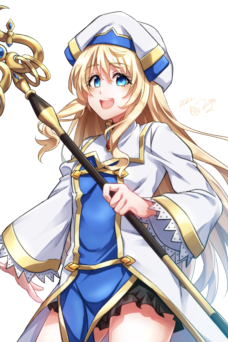 1girl :d black_skirt blonde_hair blue_eyes coat cowboy_shot dated frilled_sleeves frills goblin_slayer! highres holding holding_staff kankitukou long_hair long_sleeves looking_at_viewer open_mouth pleated_skirt priestess_(goblin_slayer!) simple_background skirt smile solo staff white_background white_coat white_headwear