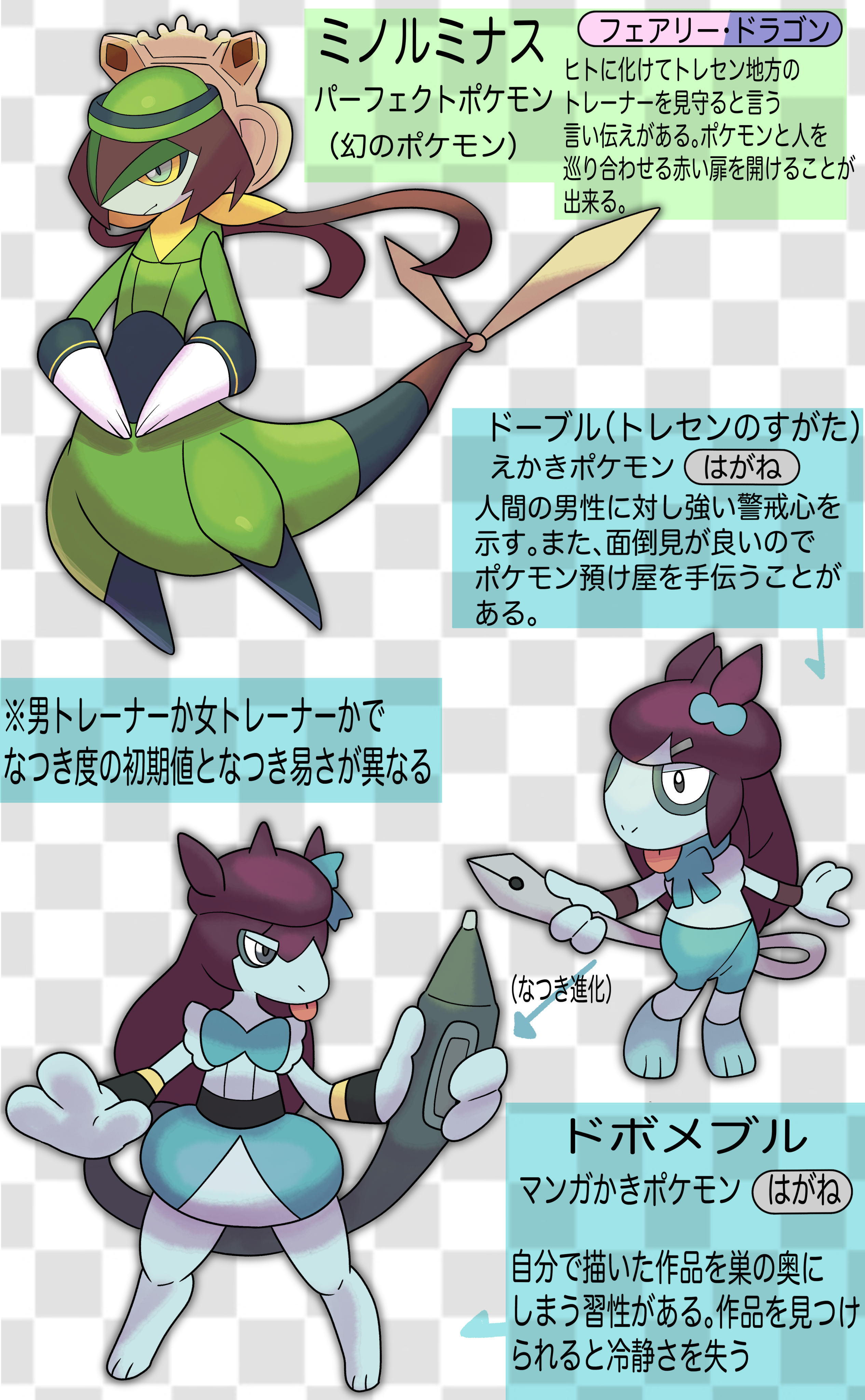 absurdres aqua_bow beret bow bowler_hat checkered_background commentary_request ear_bow evolutionary_line fakemon fusion gen_2_pokemon gen_5_pokemon green_headwear hair_bow hat hayakawa_tazuna highres holding katwo mejiro_dober_(umamusume) nintendo no_humans pokemon servine smeargle split_ponytail tongue tongue_out translation_request umamusume yellow_bow