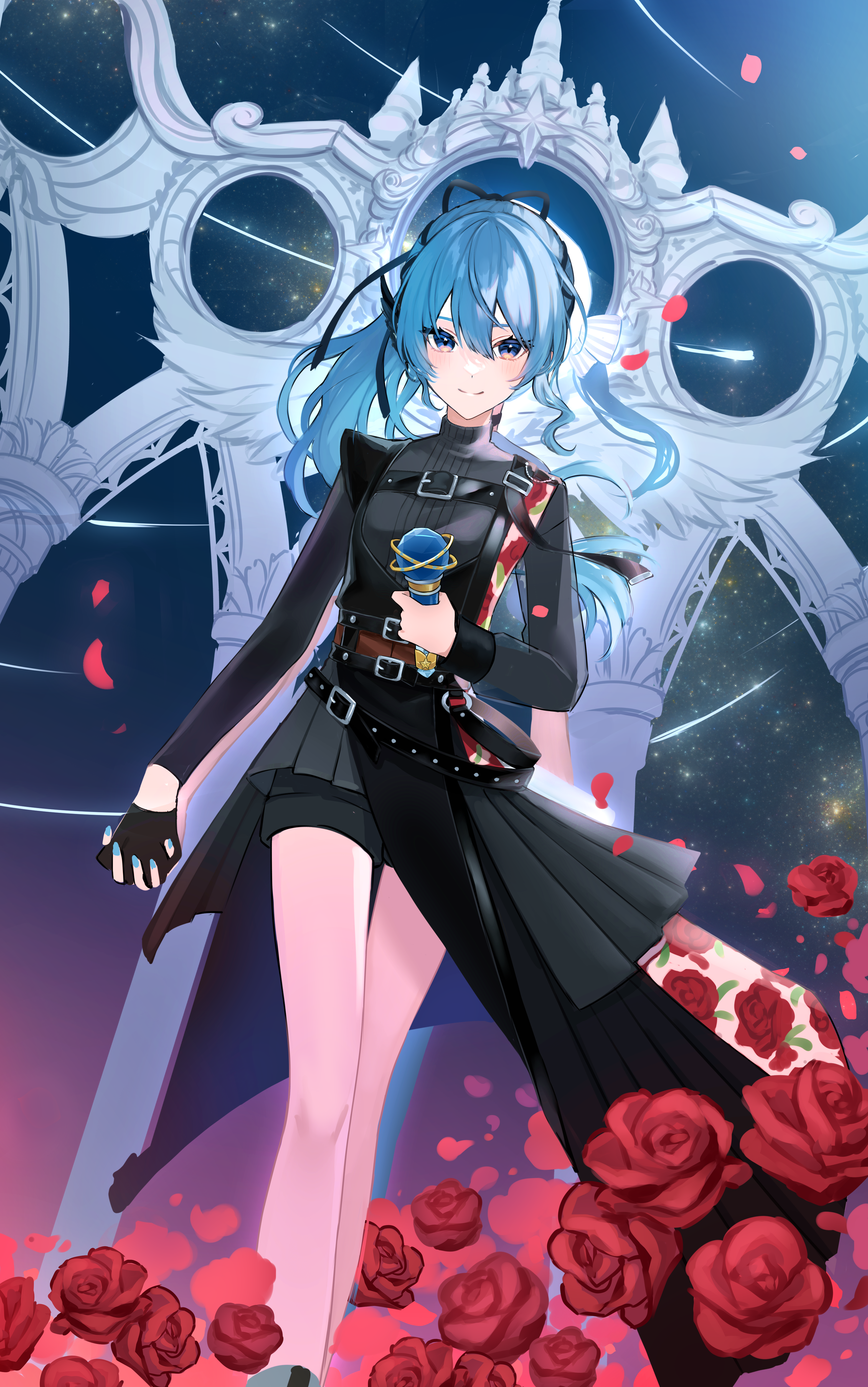 2girls absurdres back-to-back bare_legs belt black_gloves black_shirt black_shorts black_skirt blue_hair blue_nails closed_mouth dual_persona floating_hair floral_print flower gloves gradient_eyes high_ponytail highres holding holding_hands holding_microphone hololive hoshimachi_suisei hoshimachi_suisei_(shout_in_crisis) long_hair long_sleeves looking_at_viewer microphone multicolored_eyes multiple_girls official_alternate_costume petals ponytail red_flower red_rose rose rose_petals rose_print shirt short_shorts shorts single_glove skirt smile soda_dokka_ikou solo_focus star_(symbol) star_in_eye symbol_in_eye thighs virtual_youtuber
