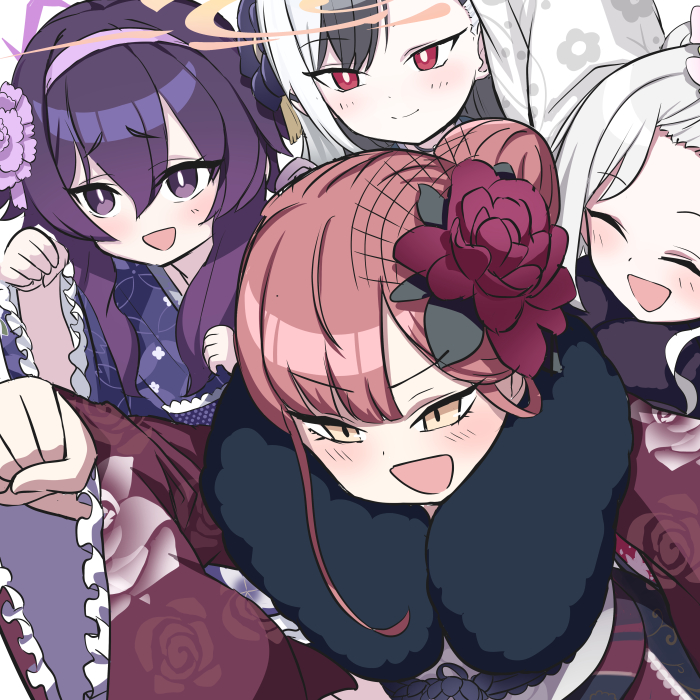 4girls :d ^_^ aru_(blue_archive) aru_(new_year)_(blue_archive) black_choker blue_archive blunt_bangs choker clenched_hand closed_eyes commentary_request flower fur_scarf grey_hair hair_between_eyes hair_flower hair_ornament halo haruka_(blue_archive) haruka_(new_year)_(blue_archive) japanese_clothes kayoko_(blue_archive) kayoko_(new_year)_(blue_archive) kimono long_hair long_sleeves looking_at_viewer multicolored_hair multiple_girls mutsuki_(blue_archive) mutsuki_(new_year)_(blue_archive) obi obiage official_alternate_costume open_mouth parted_bangs purple_eyes purple_hair raised_fist red_eyes red_hair sash shooka short_hair short_hair_with_long_locks sidelocks simple_background smile two-tone_hair white_background white_hair wide_sleeves yellow_eyes