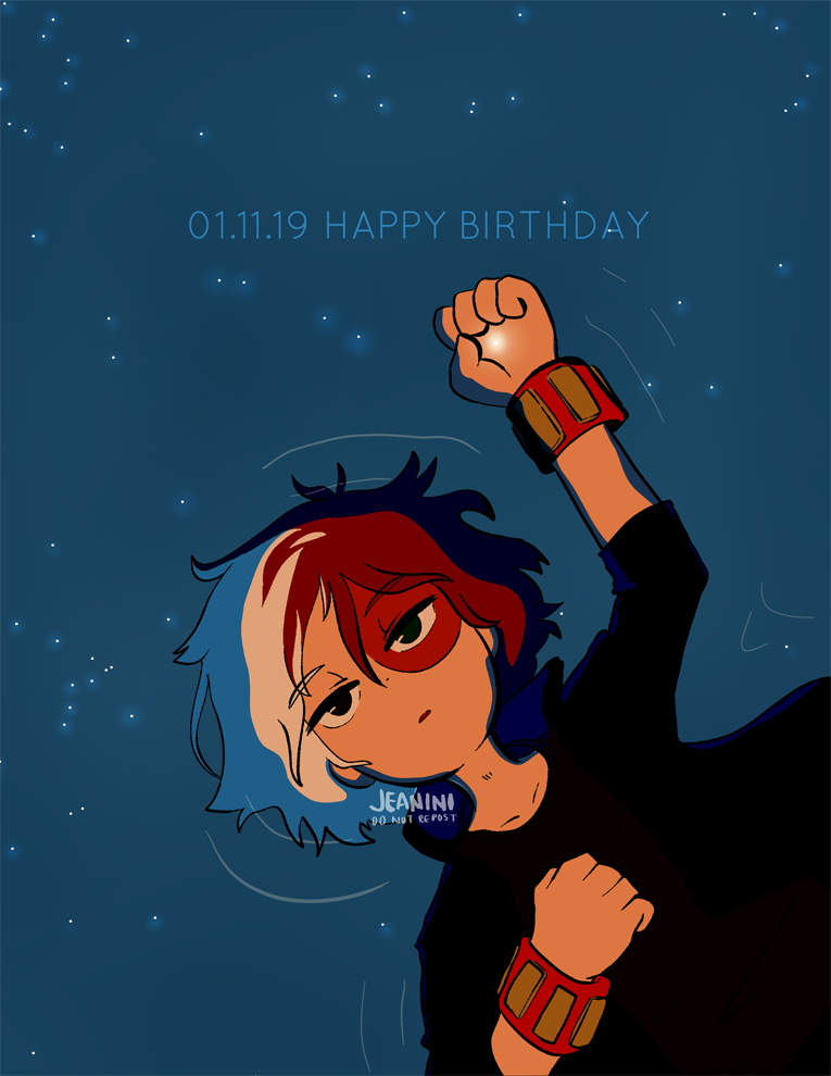 1boy artist_name black_eyes blue_background boku_no_hero_academia burn_scar commentary english_commentary english_text hair_between_eyes happy_birthday jeanini looking_at_viewer lying male_focus multicolored_hair on_back red_hair scar scar_on_face short_hair solo split-color_hair star_(sky) todoroki_shoto two-tone_hair upper_body white_hair wristband