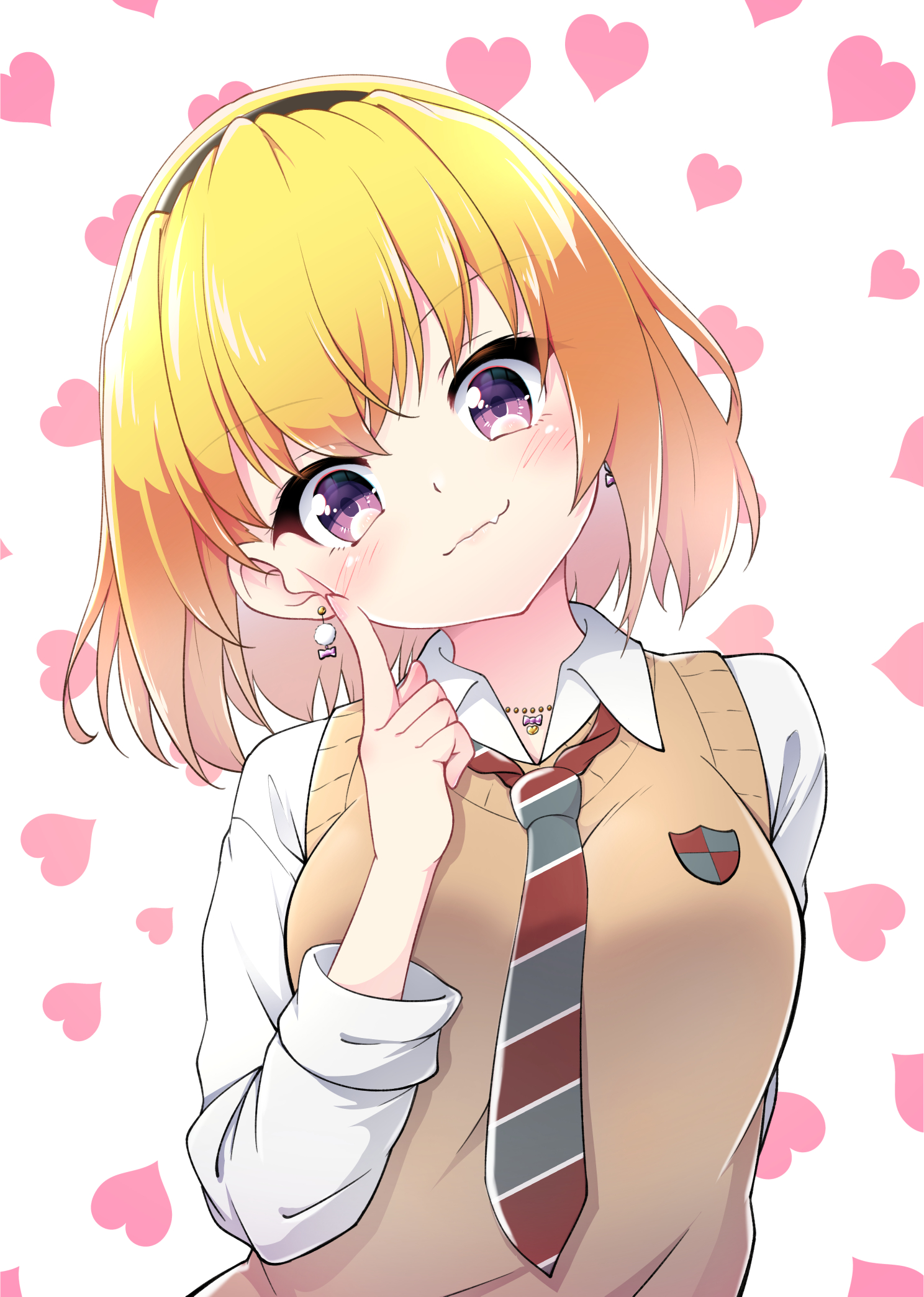1girl black_hairband blonde_hair blush brown_sweater_vest closed_mouth collared_shirt earrings fang finger_to_face hairband hazumi_otoya heart heart_background highres higurashi_no_naku_koro_ni houjou_satoko jewelry looking_at_viewer necklace necktie purple_eyes shirt short_hair skin_fang solo striped_clothes striped_necktie sweater_vest upper_body white_shirt
