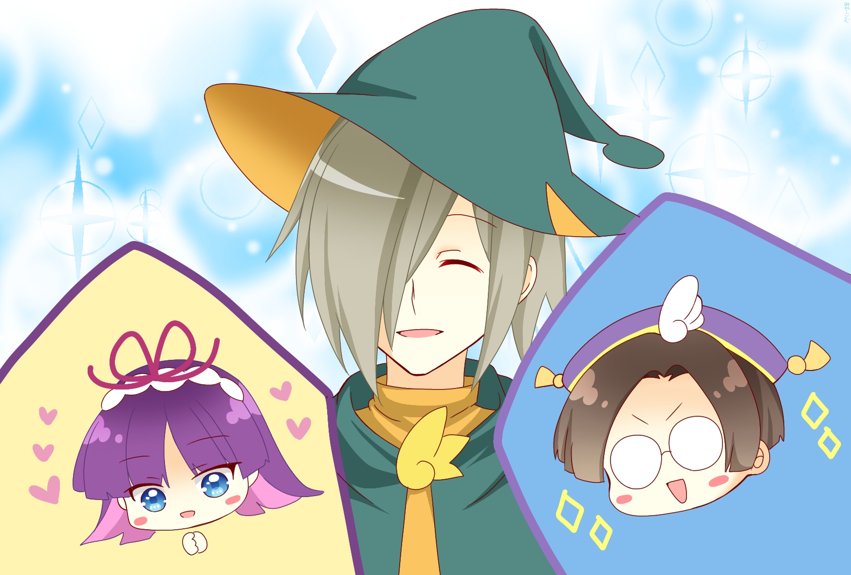 blue_eyes blush bow brown_hair closed_eyes feli_(puyopuyo) glasses green_headwear grey_hair hair_over_one_eye hat heart highres klug_(puyopuyo) lemres_(puyopuyo) miyakomu purple_hair purple_headwear puyopuyo red_bow smile wizard_hat