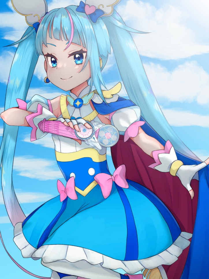 1girl blue_dress blue_eyes blue_hair blue_sky bow cape closed_mouth cloud cloudy_sky commentary cure_sky day detached_sleeves dress earrings fingerless_gloves frilled_dress frills gloves gradient_hair hair_ornament hairband hirogaru_sky!_precure jewelry legs_up long_hair looking_at_viewer magical_girl medium_dress multicolored_hair mumei_(yr_0920) outdoors pink_bow pink_hairband precure puffy_detached_sleeves puffy_sleeves sky sky_mirage sleeveless sleeveless_dress smile solo sora_harewataru standing streaked_hair thighhighs twintails two-sided_cape two-sided_fabric very_long_hair white_gloves white_thighhighs wing_hair_ornament