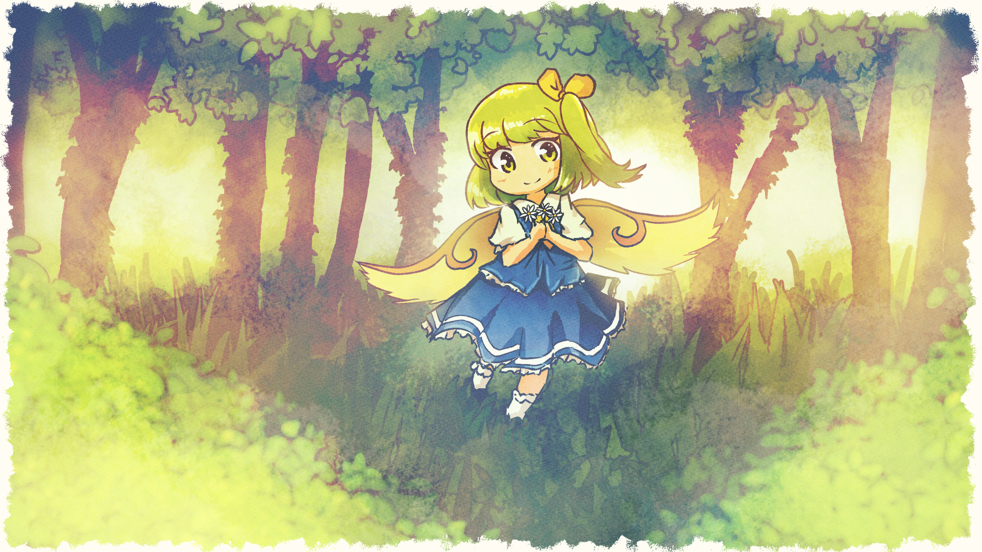 1girl blue_skirt chibi daiyousei fairy_wings green_eyes green_hair highres looking_at_viewer own_hands_together side_ponytail skirt smile solo standing standing_on_one_leg thighhighs touhou tree white_thighhighs wings yoirone