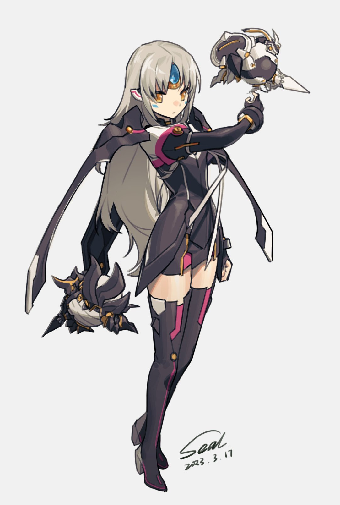 1girl 2023 airseal android armor black_dress black_thighhighs closed_mouth code:_nemesis_(elsword) commentary dated dress elsword eve_(elsword) expressionless facial_mark floating floating_object forehead_jewel full_body grey_hair highres long_hair long_sleeves looking_at_viewer moby_(elsword) parted_bangs raven_cronwell remy_(elsword) robot robot_ears shoulder_armor signature simple_background thighhighs white_background