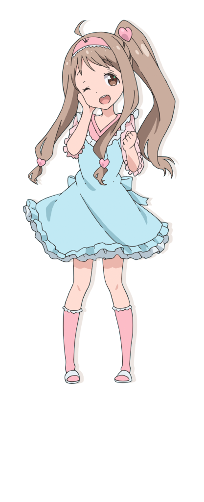 1girl ahoge blue_dress brown_eyes dress frilled_dress frilled_socks frills full_body hair_ornament hairband hand_on_own_cheek hand_on_own_face hayase_kinue headband heart heart_hair_ornament light_brown_hair long_hair looking_at_viewer masamune-kun_no_revenge official_art one_eye_closed open_mouth pink_hairband pink_headband pink_socks side_ponytail sidelocks simple_background socks solo standing tachi-e transparent_background