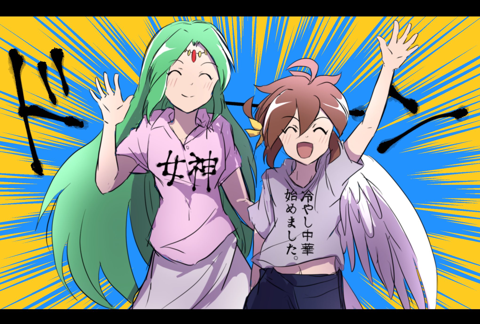 1boy 1girl alternate_costume angel angel_wings blush brown_hair closed_eyes collared_shirt cowboy_shot forehead_jewel green_hair grey_shirt hand_up highres kid_icarus laurel_crown long_hair nintendo open_mouth palutena pink_shirt pit_(kid_icarus) rune_(ruupokesmash54) shirt smile translation_request wings