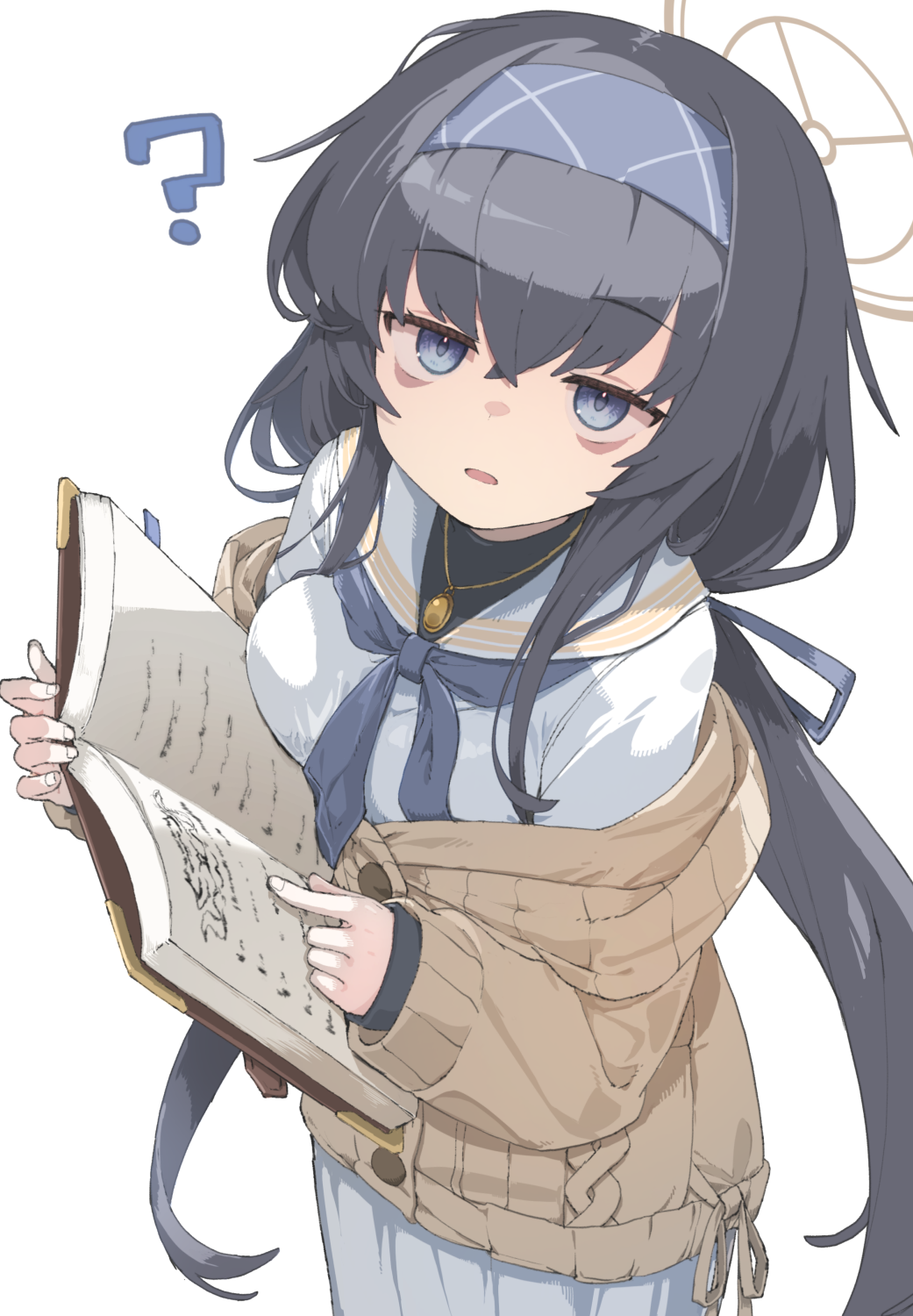 1girl ? bags_under_eyes black_hair blue_archive book bow commentary grey_eyes hair_between_eyes hair_bow hair_ribbon hairband halo highres holding holding_book hoshi_umi jewelry long_hair long_skirt looking_at_viewer low_twintails necklace parted_lips pleated_skirt pointing ribbed_sweater ribbon school_uniform serafuku sidelocks simple_background skirt solo sweater turtleneck turtleneck_sweater twintails ui_(blue_archive) white_background