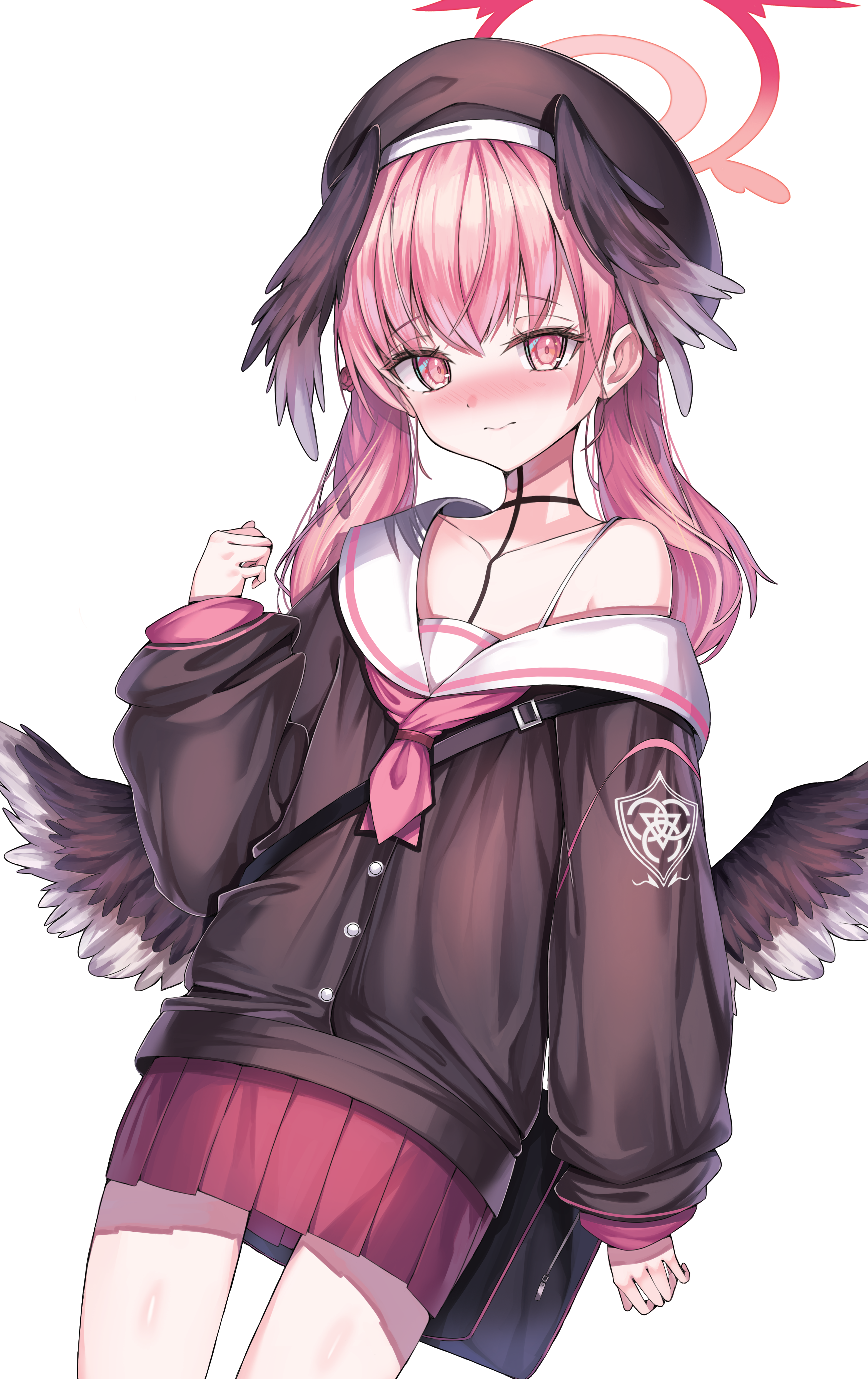 1girl 3: absurdres alter_(kxk7357) bag black_wings blue_archive blush choker collarbone commentary_request feathered_wings hair_between_eyes halo hat head_wings highres koharu_(blue_archive) long_hair long_sleeves looking_at_viewer pink_eyes pink_hair pleated_skirt school_bag school_hat school_uniform serafuku shoulder_bag sidelocks simple_background skirt solo spaghetti_strap twintails white_background wings