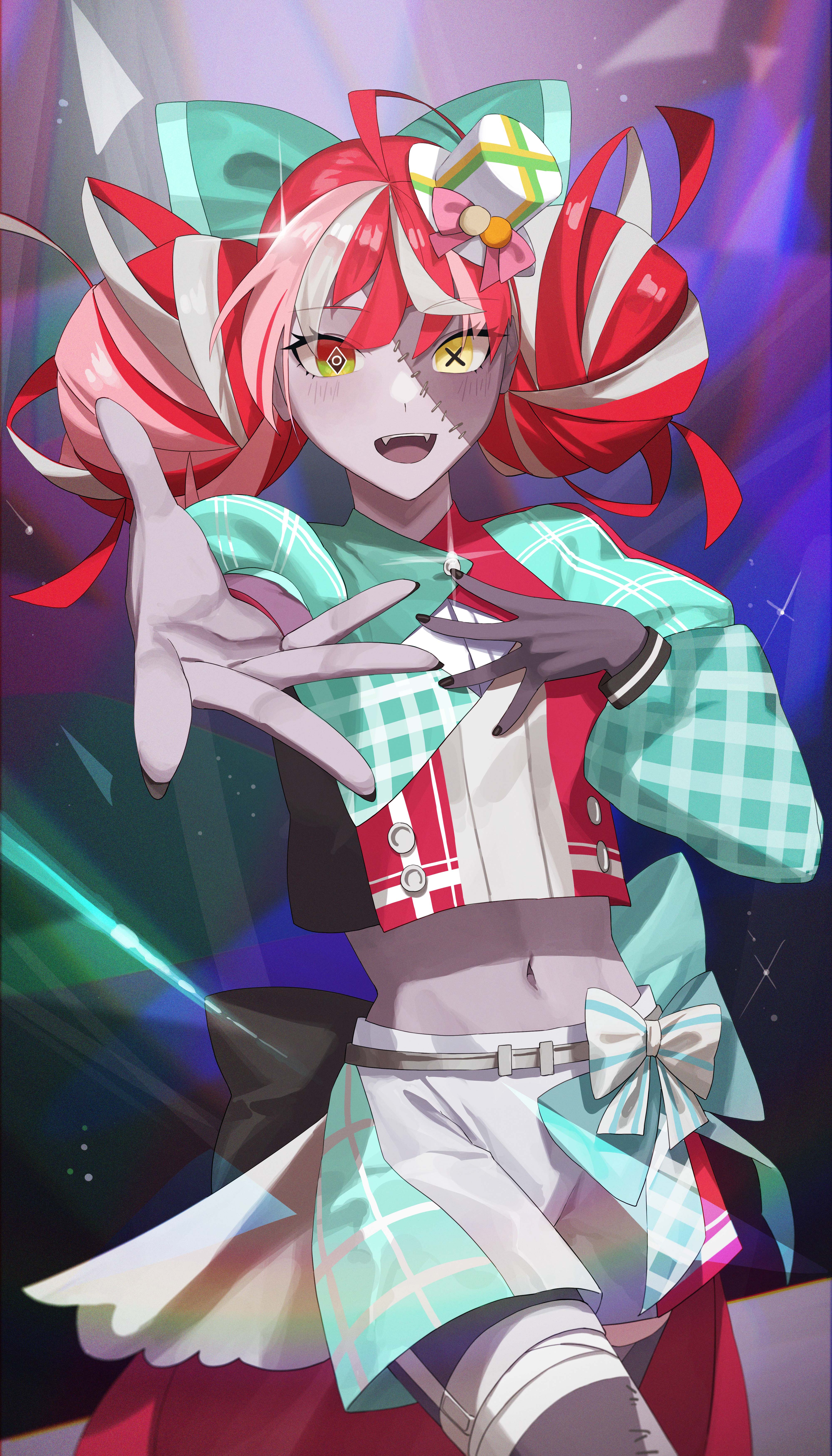 1girl absurdres black_gloves black_nails blush bow colored_skin double_bun gloves grey_skin hair_bow hair_bun hair_ornament heterochromia highres hololive hololive_idol_uniform_(bright) hololive_indonesia kureiji_ollie long_sleeves looking_at_viewer mm_(mhm2592) navel open_mouth shirt single_glove skirt smile standing symbol-shaped_pupils virtual_youtuber zombie
