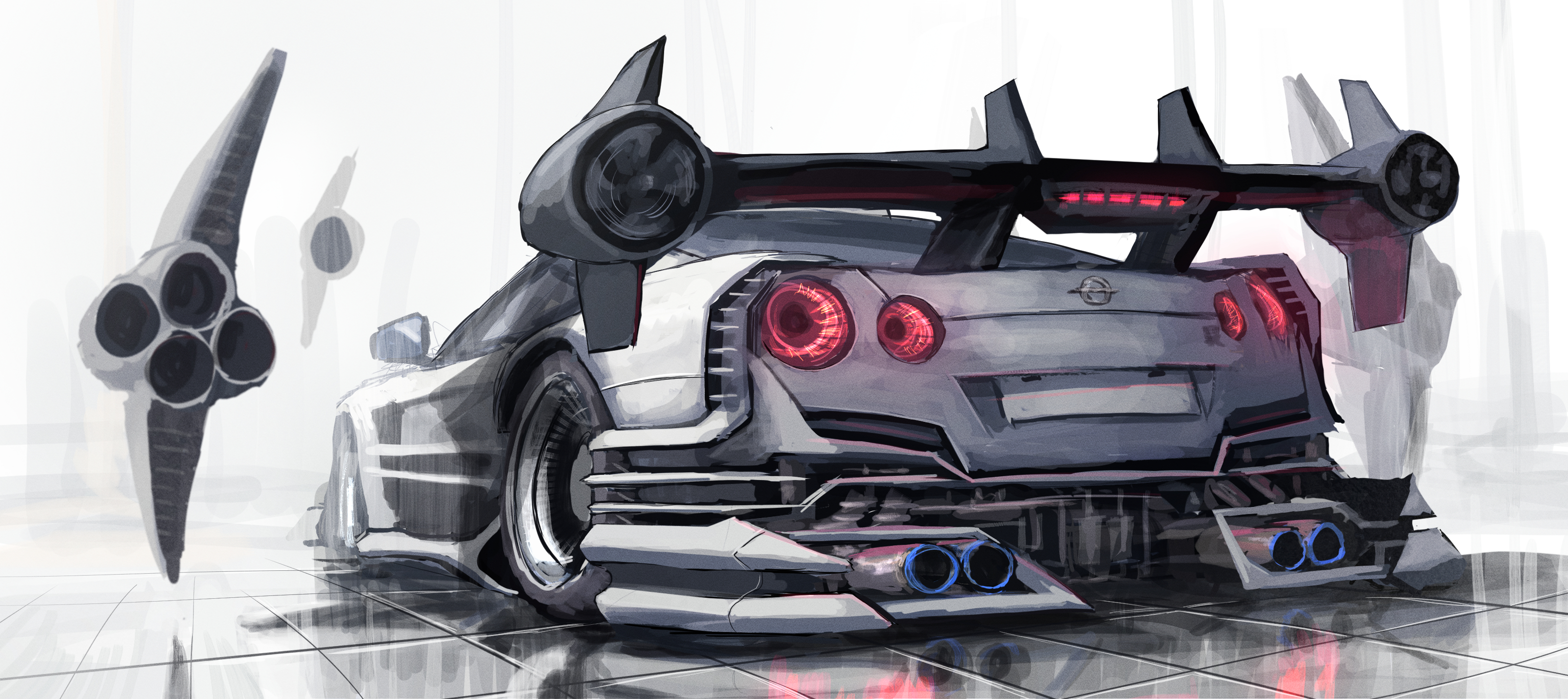 absurdres car from_behind highres motor_vehicle nissan nissan_gt-r no_humans original science_fiction shiyo_tsubame solo spoiler_(automobile) sports_car thrusters vehicle_focus