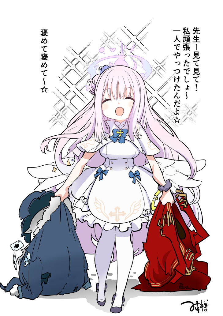 1boy 1girl 1other angel_wings blue_archive bowler_hat card closed_eyes clothes_grab collar_grab cross dragging goz_(blue_archive) halo happy hat hieronymus_(blue_archive) kimura_mitsuhiro mika_(blue_archive) neckwear_grab pink_hair playing_card red_hood signature torn_clothes translation_request wings