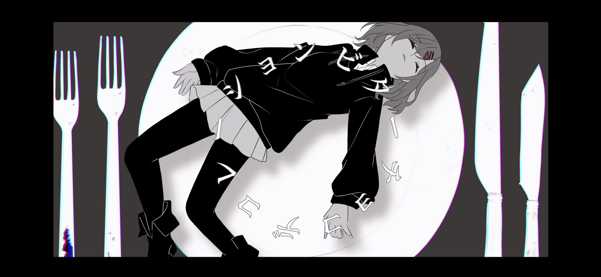 1girl closed_eyes commentary_request fork grey_background greyscale hair_ornament hairclip highres higuchi_madoka idolmaster idolmaster_shiny_colors knife long_sleeves miniskirt monochrome pantyhose plate pleated_skirt short_hair shu10 skirt spot_color sweater swept_bangs translation_request