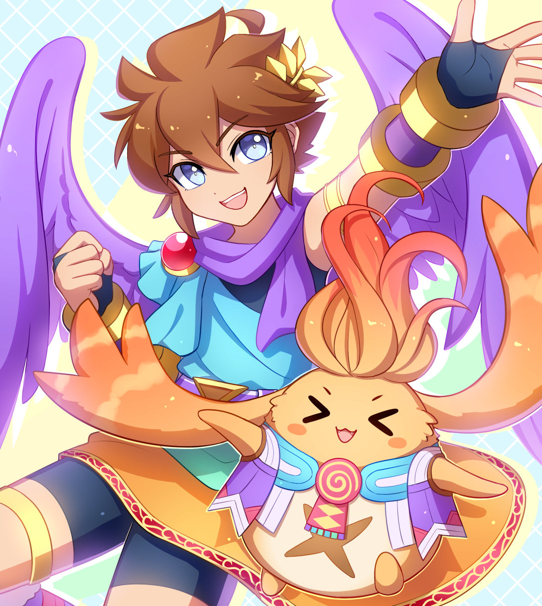 >_< 1boy alternate_color angel angel_wings armband armlet blue_eyes blush_stickers brown_hair clenched_hand enni highres jewelry kid_icarus laurel_crown nintendo nopon open_mouth orange_fur outstretched_arm pit_(kid_icarus) purple_wings riki_(xenoblade) smile super_smash_bros. wings xenoblade_chronicles_(series) xenoblade_chronicles_1