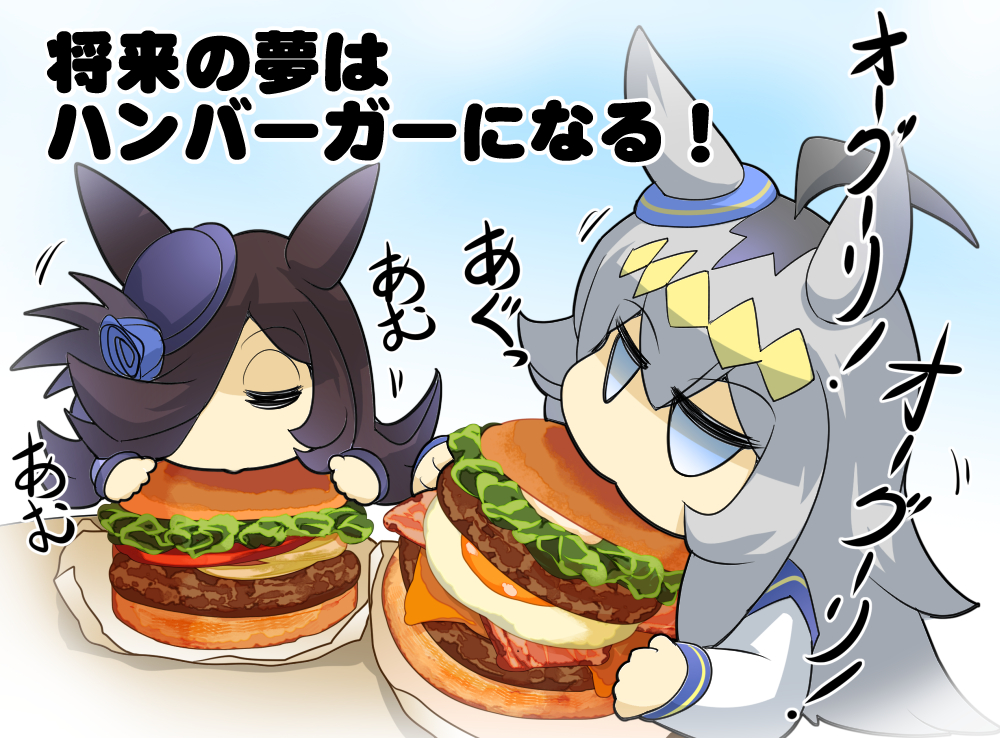 2girls ahoge animal_ears blue_background blue_flower blue_headwear blue_rose brown_hair burger chibi closed_eyes comic commentary ear_ornament eating egg fascinator flower food gradient_background grey_eyes grey_hair hair_between_eyes hair_over_one_eye hairband hat hat_flower hisahiko holding holding_food horse_ears horse_girl long_hair long_sleeves meme motion_lines multicolored_hair multiple_girls oguri_cap_(umamusume) oguri_oguri_(meme) oversized_food oversized_object photorealistic realistic rice_shower_(umamusume) rose sound_effects swept_bangs tilted_headwear translated twitter_username two-tone_hair umamusume upper_body yellow_hairband