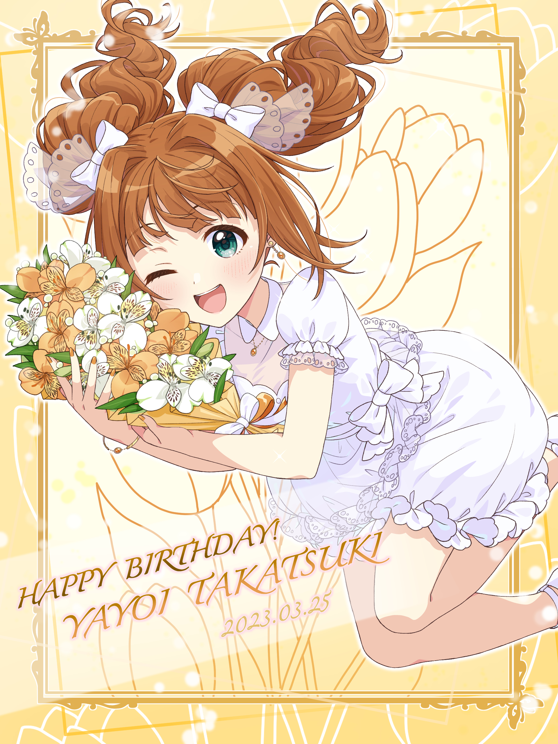 1girl ;d absurdres blush bouquet brown_hair bug butterfly character_name dot_nose dress earrings floral_background flower frilled_dress frills gradient_background green_eyes grid_background hair_ribbon happy_birthday highres holding holding_bouquet idolmaster idolmaster_(classic) idolmaster_million_live! idolmaster_million_live!_theater_days insect jewelry lace_trim long_hair looking_at_viewer necklace one_eye_closed open_mouth orange_flower orange_ribbon ribbon round_teeth shiro_(ongrokm) short_sleeves smile solo takatsuki_yayoi teeth thighs tulip twintails white_dress white_flower white_ribbon yellow_background