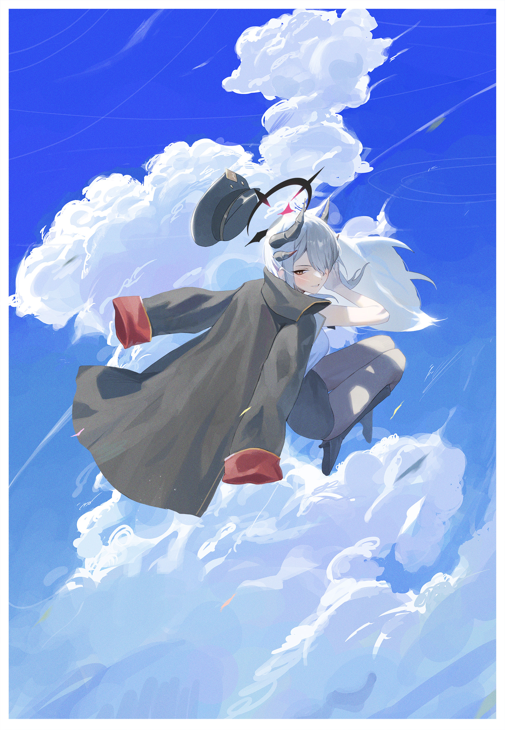 1girl black_boots black_coat black_headwear black_horns blue_archive boots border cloud coat coat_on_shoulders floating grin hair_over_one_eye halo highres horns kji_(rozo) light_blush long_hair looking_at_viewer makoto_(blue_archive) multiple_horns pantyhose pencil_skirt skirt sky smile solo white_border white_hair wide_shot