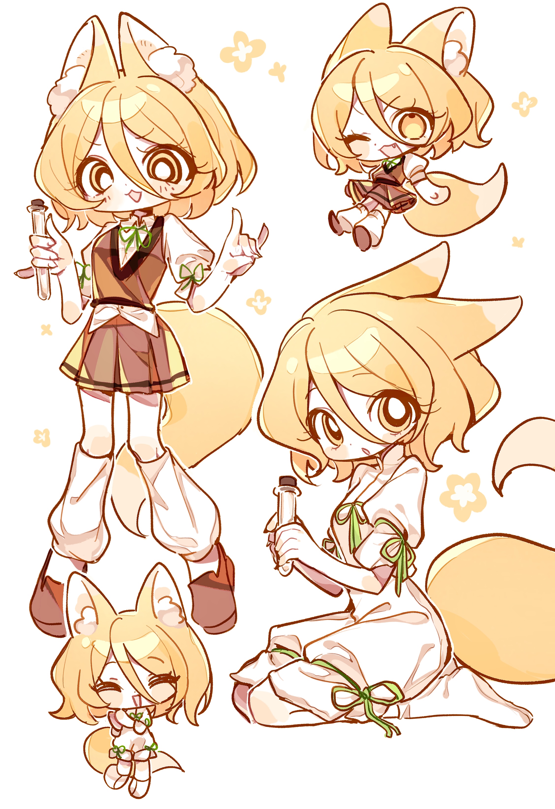 1girl :3 :d :o ;d ^_^ absurdres alternate_costume animal_ear_fluff animal_ears brown_footwear brown_skirt brown_vest chibi closed_eyes collared_shirt commentary_request corked_bottle fox_ears fox_girl fox_shadow_puppet fox_tail green_ribbon hands_up highres holding holding_test_tube kudamaki_tsukasa leg_warmers looking_at_viewer medium_hair multiple_views neck_ribbon one_eye_closed open_mouth orange_eyes pleated_skirt puffy_short_sleeves puffy_sleeves ribbon romper seiza shirt short_sleeves simple_background sitting skirt smile socks springarashi02 tail test_tube touhou vest white_background white_romper white_shirt white_socks