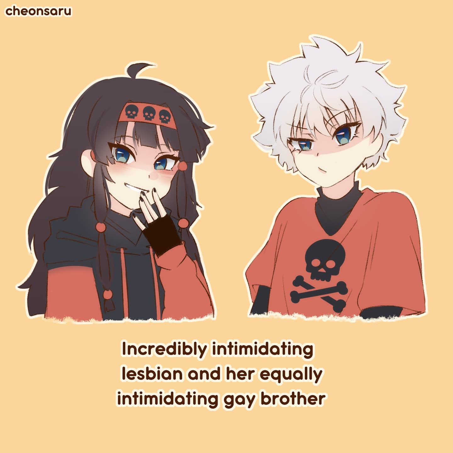 1boy 1girl alluka_zoldyck black_hair blue_eyes brother_and_sister cheonsaru child english_text fingerless_gloves gloves hair_ornament headband highres hood hoodie hunter_x_hunter killua_zoldyck long_hair looking_at_viewer red_shirt shirt short_hair short_sleeves siblings signature simple_background skull_print smile white_hair
