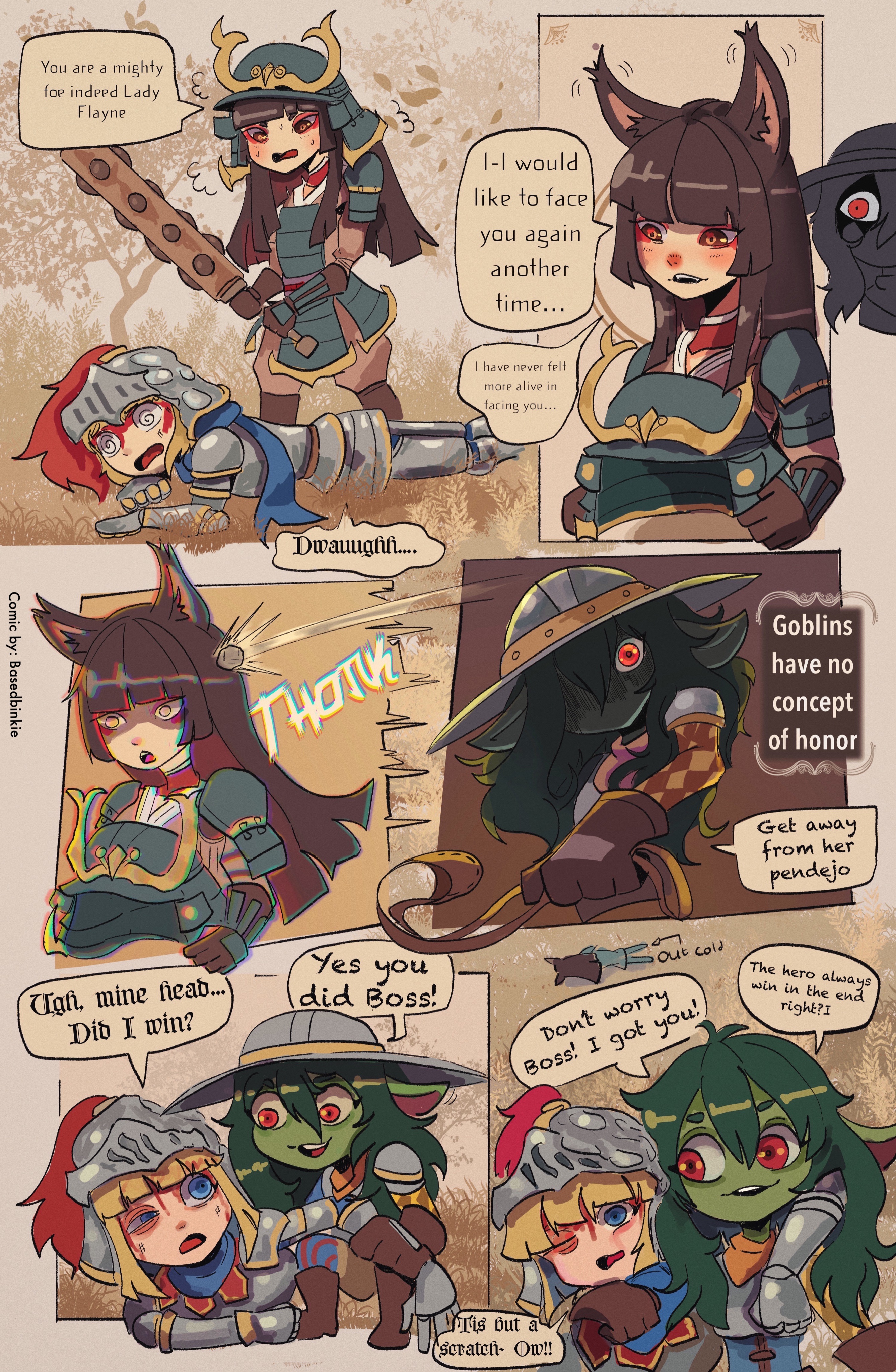 3girls absurdres armor basedbinkie black_hair blonde_hair blue_eyes blush brown_eyes club club_(weapon) colored_skin comic cuirass embarrassed english_text eye_trail eyeshadow female_goblin flayne_(basedbinkie) fox_girl full_armor gauntlets goblin green_hair green_skin gun_sling hair_between_eyes hat helmet highres holding holding_club holding_sword holding_weapon japanese_armor kabuto_(helmet) kanabou katana keiko_matsumori_(basedbinkie) knight light_trail long_hair looking_up makeup multiple_girls original pauldrons petals red_eyes red_eyeshadow samurai sancha_gobzales_(basedbinkie) sheath sheathing shoulder_armor smile sode speech_bubble surprised sword visor_(armor) weapon