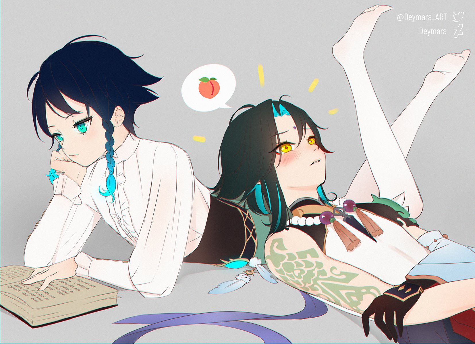 2boys androgynous aqua_eyes aqua_hair arm_tattoo ass bead_necklace beads black_gloves black_hair blush book braid corset detached_sleeves deymara diamond-shaped_pupils diamond_(shape) eyeshadow facial_mark food forehead_mark frilled_sleeves frills fruit genshin_impact gloves gradient_hair green_gloves green_hair green_shorts grey_background highres jewelry juliet_sleeves long_sleeves looking_down looking_up makeup male_focus multicolored_hair multiple_boys necklace open_book peach puffy_sleeves red_eyeshadow shirt short_hair_with_long_locks shorts shoulder_spikes side_braids single_detached_sleeve spikes symbol-shaped_pupils tattoo trap trap_on_trap twin_braids venti_(genshin_impact) white_shirt xiao_(genshin_impact) yaoi yellow_eyes